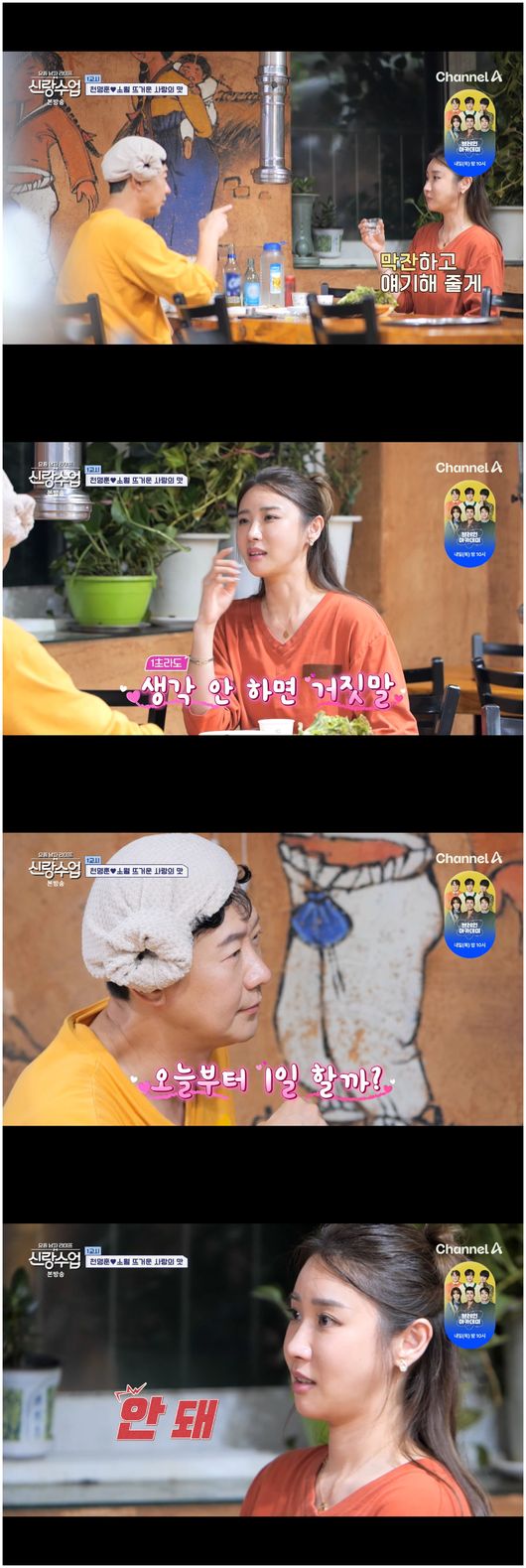 [OSEN=오세진기자]'요즘남자라이프신랑수업'가수천명훈이중국인피부과CEO소월에게자신의마음을드디어드러냈다.16일방영한채널A예능'요즘남자라이프신랑수업'(이하'신랑수업')에서는천명훈과소월의데이트가그려졌다.한낮무더운더위에황톳길맨발걷기이후찜질방으로향한천명훈은소월에게모든걸맞춰주고자했다.천명훈은“원초적인질문이긴한데,너는어떤남자스타일을좋아하니?”라며살며시운을뗐다.소월은“내스타일?나?잘생긴남자”라며단답했고,현재의천명훈외모에대해서는긍정적인반응을보이지않았다.천명훈은“우리가몇번만나봤잖아.한순간정도,내가오빠지만남자로생각한적있었을까?”라며다시한번고백의뜸을들였다.소월은“오빠가막이렇게하는데1초라도생각안한다면거짓말이다.노래하는모습을보면어느사람이라도보면감동할거다.애쓰는모습아니냐”라며좋게밀어냈으나,천명훈은“앞으로세번째인데,네번째,다섯번째,진지하게만나볼래?”라면서“오늘부터1일할까?”라며물었다.그러나소월은“안돼!난아직까지오빠의편한오빠이미지인데,갑자기툭들어오면당황스럽다”라고말했고,천명훈은“’열번찍어안넘어가는나무없다’라는속담이있다.앞으로아홉번이남은거다”라며의욕을저버리지않았다./[email protected][사진]채널A'요즘남자라이프신랑수업'Copyright©OSEN.무단전재및재배포금지.