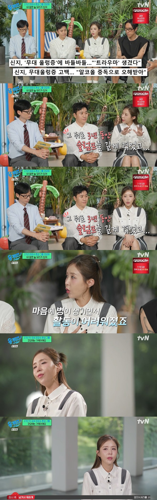 tvN‘유퀴즈온더블럭’캡처tvN‘유퀴즈온더블럭’캡처[뉴스엔서유나기자]코요태신지가멤버들에대한미안함과고마움을고백했다.7월16일방송된tvN예능'유퀴즈온더블럭'(이하'유퀴즈')302회에는27년차최장수혼성그룹코요태김종민,빽가,신지가게스트로출연했다.이날빽가는최근신지의결혼논란이후본인의소셜계정에올려화제가된단체사진을언급했다.빽가는"제가올린사진이제휴대폰배경화면이다.아무생각없이매일보는건데,보는데'우리가가족이구나'(싶더라).갑자기이승환형의'가족'이생각나는거다.샤워하면서틀어놨는데진짜눈물이날것같은거다.우리코요태가20년넘는게샤워하면서돌아가는거다.그러면서'진짜내가정말이렇게멤버들을신지를생각하는구나'를저도몰랐던걸알게됐다"고밝혔다.신지는"제가안좋은방향으로이야기들이흘러가니까속상했을것.그러다보니까옛날생각도하게된것같다"며이런빽가의마음을충분히이해했다.결국울컥한신지는"제가잘해야한다.하다보면저한테는가족이코요태고코요태가신지고신지가코요태가자연스럽게연결된다.혹여라도팀에피해가갈까봐.저는댓글이나반응을다본다.가끔'너때문에코요태끝났다','너때문에코요태망했다'는댓글이어떤댓글보다무섭고아프고힘들다.저희는굳건한데저하나때문에혹시라도멤버들까지휩쓸려서미움을받을까봐걱정이긴한데멤버들은늘얘기한다.'우리아무것도없이시작했다.너한텐우리가있잖아'라고얘기해줘서그게힘이된다.미안하기도하고"고말했다.김종민은"신지야,정말어릴때부터코요태를지키느라고.그러다보니외부에서일어나는받아들이기쉽지않은일이많았을텐데앞으로본인행복에많이신경썼으면좋겠다"고마음을전했다.한편지난달7살연하가수문원과결혼을발표한신지는최근예비남편과관련한여러논란으로힘든시간을보냈다.7월2일채널'어떠신지'를통해공개된'상견례'콘텐츠에서문원이이혼경험과딸이있다는사실을신지에게감정이깊어진뒤에야고백했다고털어놓으며파장이일어난것.여기에문원의"신지가유명한사람인줄몰랐다"는발언과김종민,빽가에게보인태도도누리꾼들의질타를받았으며,문원에대한폭로성댓글까지쏟아지면서대중들은우려를표했다.하지만신지소속사제이지스타측은8일공식입장문을통해문원을둘러싼각종의혹을해명하며루머를정정했다.또"당사는아티스트를보호하기위해최선을다할것이며,허위사실을유포하거나명예를훼손시키는행위에대해서는법적대응등을검토할수있다는점말씀드린다"고알렸다.신지역시9일본인의소셜미디어서비스계정을통해"여러분의걱정어린의견과의혹을소속사와함께모두확인했으며의혹은모두사실이아니라는것을확인했다"며"여러분들께서보내주신관심과우려의말씀들을충분히이해하고있다.고민하고더살피도록하겠다"고전했다.뉴스엔서유나stranger77@기사제보및보도자료[email protected]ⓒ뉴스엔.무단전재&재배포금지Copyright©뉴스엔.무단전재및재배포금지.