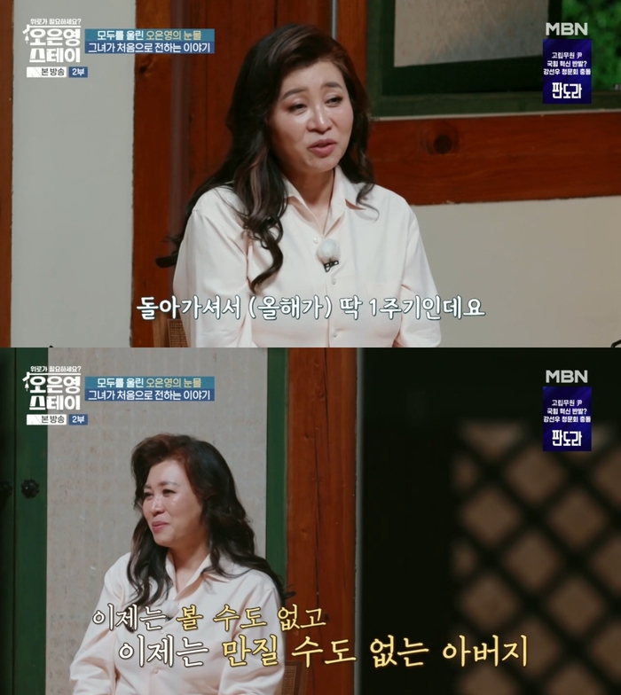 ‘오은영스테이’.사진IMBN‘오은영스테이’방송캡처정신건강의학과전문의오은영박사가돌아가신아버지를떠올리며눈물을흘렸다.14일방송된MBN‘오은영스테이’에서는돌아가신아버지를떠올리는오은영의모습이그려졌다.이날오은영은“작년에아버지가돌아가셔서(올해가)딱1주기다.너무나를사랑해주신아버지다”라고입을열었다.오은영은“내가의과대학다닐때워낙새벽에나가고밤중에들어오니까아버지가중고차하나를사주셨다.아버지가아침에언제나꼭시동을미리걸어주셨다.날씨가아무리추워도한30분에서1시간먼저나가셔서차를따뜻하게데워주셨다.굉장히자상한아버지셨다”고말했다.이어“내가미국출장가있는동안아버지가냉장고에서얼음을꺼내시다가넘어지셨다.너무아파하시니까병원에서진통제를처방해줬는데연세가많으신분들은진통제를드시면섬망비슷하게헛소리를하실수있다.내가귀국하는날아버지가통증을참으시면서진통제를일부러안드셨더라”라고했다.그러면서“내가집에들어가서‘사랑하는딸왔다’라며아버지를쓰다듬어드렸더니‘은영아.너를기다렸다.너같은딸을낳아서난너무행복했다.너무사랑한다’라며내손을잡으셨다.내가눈물을펑펑쏟으면서아버지를안고‘사랑한다’라고얼마나많이했는지모른다.그리고다음날입원을하셔서쭉병원에계시다가작년6월5일에소천하셨다”고덧붙였다.오은영은“아버지의시신을안치하며이제는볼수도없고만질수도없고목소리를들을수도없다고통곡했다.우리나중에꼭만나자고이야기했다.기다리고계시라고”라며눈물을흘렸다.한편‘오은영스테이’는매주월요일오후9시10분방송된다.[이세빈스타투데이객원기자]Copyright©스타투데이.무단전재,재배포및AI학습이용금지