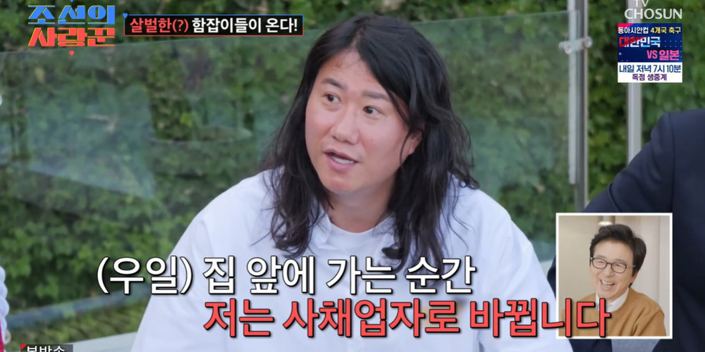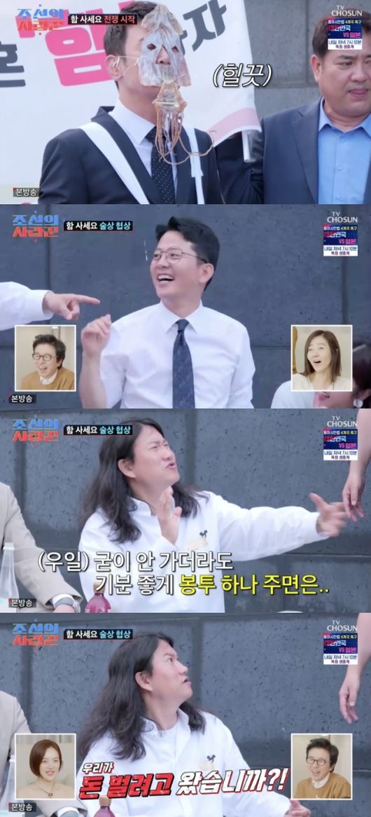 TV조선‘조선의사랑꾼’캡처TV조선‘조선의사랑꾼’캡처TV조선‘조선의사랑꾼’캡처[뉴스엔하지원기자]개그맨임우일이사채업자로빙의했다.7월14일방송된TV조선'조선의사랑꾼'에서는새신랑김준호의위기가득한'함DAY'가공개됐다.이날김준호의함잡이로는코미디언김대희와임우일,그리고김준호의지인두명이함께했다.함진아비를맡은김대희는"제가끌려서신부집으로들어가면끝난다.무조건잡아끌거다.잘막아달라"라고당부했다.이들은목표액으로400만원을설정했다.임우일은"개그콘서트후배들을위해서기부금을주고알아서쓰라고하자"라고제안했다.특히임우일은"그집앞에가는순간저는사채업자로바뀐다.'비열한거리'조인성씨로가겠다"면서무시무시한대치를예고해웃음을자아냈다.뉴스엔하지원oni1222@기사제보및보도자료[email protected]ⓒ뉴스엔.무단전재&재배포금지Copyright©뉴스엔.무단전재및재배포금지.
