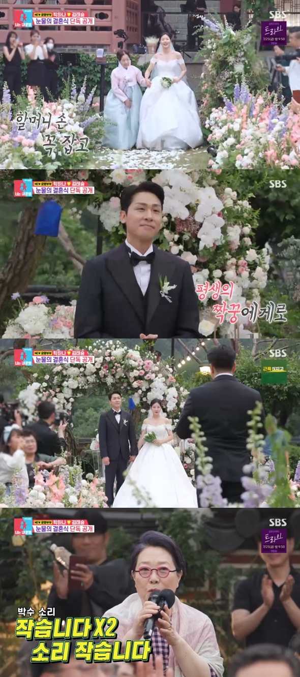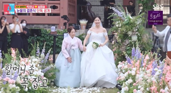 ▲출처|SBS'동상이몽2-너는내운명'캡처[스포티비뉴스최신애기자]박하나-김태술의꿈같은야외결혼식이공개됐다.14일방송된SBS'동상이몽2-너는내운명'에서는배우박하나와농구감독김태술의결혼식현장이공개됐다.이날박하나-김태술은야외결혼식을치렀다.하객으로는평소절친한양희경,박탐희는물론이연두,전수경,최수린,최명길,김나운,이일화,이세희,김혜은,김영옥,안보현,김가연,강신일등이참석했다.또한'동상이몽2'팀과'골때녀'('골때리는그녀들')팀까지참석해시선을모았다.뿐만아니라농구선수들에이어축구선수,야구선수들까지스포츠스타들이총출동했다.특히이날박하나는아버지손이아닌할머니의손을잡고신부입장을해눈길을끌었다.박하나는할머니에대해"할머니가저를키워주셨는데최근에예쁜치매에걸리셨다"고밝혔던터.이에이모습을지켜보던MC들은"가장좋은결정을하셨다"며눈시울을붉혔다.뒤이어축가로는노을이나서'청혼'을불러줬고,박하나는'내꿈이이뤄졌다"며뭉클해했다.축사로는박하나의친오빠와김태술의친형이나서감동을안겼다.특히박하나의친오빠는자꾸만울었는데,이에대해박하나는"같이할머니손에컸다보니그마음에눈물이쏟아진것같다"고말했다.또한양희경도축사순서를맡아"슬픈일이든기쁜일이든뭐든털어놓을수있는친구같은부부가됐으면좋겠다.10년넘는편안함이느껴졌고그게오래유지될거라생각한다"고덕담했다.<저작권자ⓒSPOTVNEWS.무단전재및재배포금지>Copyright©스포티비뉴스.무단전재및재배포금지.