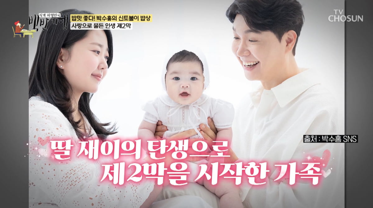 [텐아시아=김은정기자]사진=TV조선'식객허엉만의백반기행''식객허영만의백반기행'박수홍이딸바보면모를보였다.13일방송된TV조선'식객허영만의백반기행'에는혼인과출산으로제2의인생을맞이한‘베테랑방송인’박수홍과이천밥상을맛봤다.이날35년차방송인박수홍은"아내와나이차이가23살"이라고밝혔다.허영만은"강도같으니라고"라며타박했고,박수홍은"날강도죠"라며웃음을지었다.늦깎이결혼에이어54세에얻은딸재이로인해행복이두배가된박수홍은"입,코는아빠닮고,눈,이마는엄마닮았다.아주그냥미칠것같다"며'딸바보'면모를드러냈다.사진=TV조선'식객허엉만의백반기행'사진=TV조선'식객허엉만의백반기행'사진=TV조선'식객허엉만의백반기행''딸태몽'에대해박수홍은"아내가태몽을꿨는데,한손에는예쁜소라,다른손에는커다란전복이있는데아내가전복을잡았다"고전했다.허영만은"전복은여자아이"라고해몽했다.딸때문에달라진식습관도공개됐다.돼지갈비를먹던박수홍은"아깝게탔네요"라며탄고기를골라냈다.그모습을보던허영만은"아기먹일때는떼어내고,우리는그냥먹자"고했지만,그는"제가오래살아야해서죄송하다"며55세아빠의책임감을보였다."아이하고아내하고맛집투어가보고싶다"고밝힌박수홍은가게에있는딸또래의아기를보고"말하냐?우리딸은아빠,엄마를하는데너무예뻐서미치는줄알았다"며즉석에서폰영상을자랑했다.사진=TV조선'식객허엉만의백반기행'사진=TV조선'식객허엉만의백반기행'사진=TV조선'식객허엉만의백반기행'딸자랑후그는"(테이블)이게도합해서얼마죠?"라며골든벨울릴기세를드러내폭소를유발했다.박수홍은최근종영한임신출산을다룬TV조선예능'우리아기가태어났어요'에출연한바있다.그는"아내가아기낳는걸못봤는데,이프로그램하면서느낀건여성은위대하다는것"이라며감탄했다.총각인양세형의역할에대해그는"저도잘몰랐지만,세형이는'아이는12개월만에나오는거죠?'라고묻더라.남자들이출산개월수를잘모르더라"고말했다.한편,박수홍은마지막으로"여보나성공한거야,여보를만난건내인생의행운이다.앞으로도최선을다하며사랑하며살겠다"고고백했다.김은정텐아시아기자[email protected]©텐아시아.무단전재및재배포금지.