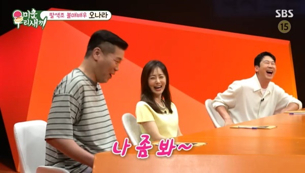 SBS‘미운우리새끼’캡처SBS‘미운우리새끼’캡처[뉴스엔유경상기자]서장훈이동갑내기오나라의친근감표시에고장났다.7월13일방송된SBS‘미운우리새끼’에서는배우오나라가출연했다.모벤져스가오나라를보고“정말예쁘다”며미모에감탄했고,오나라는서장훈을보자마자“오랜만이다.나좀봐라.보고이야기해라.보고싶었는데”라며친근감을드러내웃음을자아냈다.반면서장훈은오나라를어색해하는모습.신동엽은“이러는이유가있다.동갑내기인데친구처럼편하게말을놓고싶은데못놓고그래서한이맺혔다고한다”고오나라를대변했다.오나라는“아니서장훈이저랑있으면기빨려하는느낌이있다.제가평소팬이고좋아하는방송인인데저만옆에오면거리를두는느낌”이라고말했다.서장훈이“아니”라고부인하자오나라는“다가가도괜찮을까요?말놓자.장훈아”라며다가갔고,서장훈은“어그래.그래라”라고계속고장난반응을보였다.오나라가“장훈아우리친하게지내자”고말하자서장훈은“예”라고답했고신동엽이“뭐가또예냐.친하게지내라”며폭소했다.(사진=SBS‘미운우리새끼’캡처)뉴스엔유경상yooks@기사제보및보도자료[email protected]ⓒ뉴스엔.무단전재&재배포금지Copyright©뉴스엔.무단전재및재배포금지.