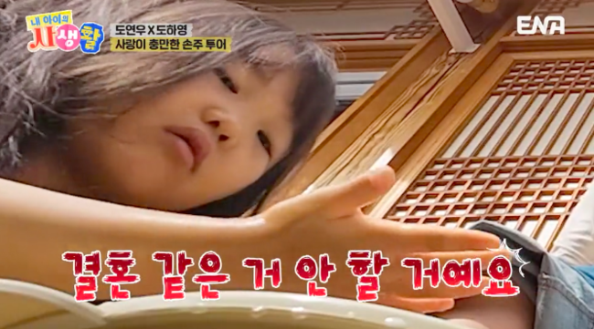 [OSEN=박하영기자]‘내아이의사생활’하영이가비혼을선언한가운데아빠도경완과결혼하고싶다고고백했다.13일방송된ENA예능‘내아이의사생활’(이하‘내생활’)에서는도도남매연우,하영이가준비한‘손주투어’2탄이그려졌다.손주투어두번째날.연우와하영이는할머니,할아버지를위해족욕서비스를했다.도경완은“저도한번도부모님발닦아드린적없는데”라며“저게보통일이아니다”라며기특해했고,장윤정도“저게보통일이아니다”라고덧붙였다.족욕서비스를받던중할아버지는“장가언제갈거냐”라고물었다.연우는“곧가겠다”라며이상형에대해“저랑호흡이잘맞으면좋겠고청순한느낌”이라고밝혔다.도경완은“엄마쪽은아닌데”라고했지만,연우는“그냥엄마같은사람이면좋겠다”라고말했다.반면하영이는“어차피결혼같은거안할거다.저는결혼안할거다”라고비혼을선언해모두를놀라게했다.장윤정은“하영이가맨날저소리한다”라고했고,할머니는“왜안하냐.해야지”라고받아쳤다.그러자하영이는“그럼아빠랑결혼할거다”라고밝혔다.연우는“아빠그럼결혼두번하는건데”라고반응했고,하영이는아빠와결혼하고싶어하는이유로“착하고나한테관심이많아요.그리고잘생겼다”라고전했다.이에도경완은“됐다.눈물나네”라며감동받는모습을보였다./mint1023/@osen.co.kr[사진]‘내아이의사생활’방송화면캡처Copyright©OSEN.무단전재및재배포금지.
