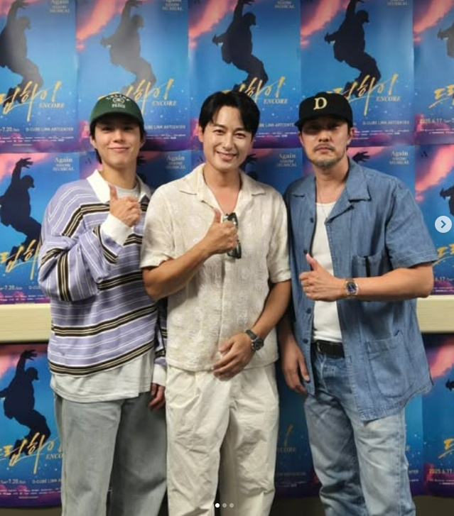 [스타뉴스|한해선기자]/사진=이지훈SNS배우박보검과소지섭이이지훈의뮤지컬을응원했다.이지훈은12일자신의계정에"드림하이보러오신두분너무감사해요"라며사진을올렸다.사진에는박보검과소지섭이이지훈이공연중인뮤지컬'드림하이'를관람한후모인모습이있었다./사진=이지훈SNS/사진=이지훈SNS이지훈은박보검과민낯투샷으로친분을밝혔고,박보검은해맑게웃으며브이자포즈를취하고선현장의분위기를띄웠다.이지훈은"더위에지친우리에게단비같은시간.거의팬미팅수준이었던무대후모습#갓지섭#갓보검"이라고덧붙이며흐뭇해했다.한편뮤지컬'드림하이-서울앵콜'은지난6월17일부터오는20일까지서울신도림디큐브링크아트센터에서진행된다.한해선기자[email protected]©스타뉴스&starnewskorea.com,무단전재및재배포금지