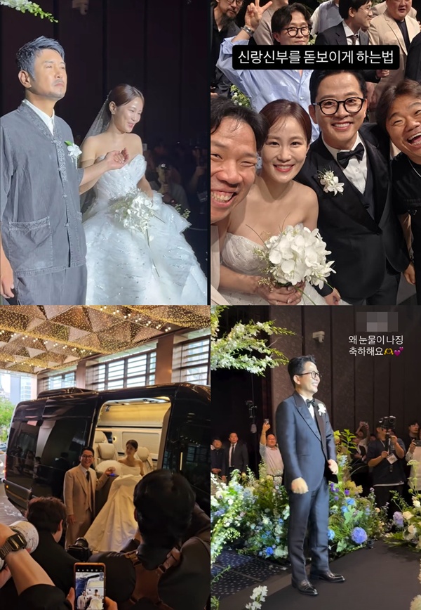 김준호김지민결혼/사진=SNS캡처[스포츠투데이임시령기자]코미디언커플김준호와김지민의결혼식현장이공개됐다.김준호,김지민은13일저녁6시서울강남의그랜드인터컨티넨탈파르나스호텔에서결혼식을올렸다.이날결혼식사회는'돌싱포맨''미우새'멤버이상민이맡았다.가수거미,변진섭은축가로특별한순간을함께했다.연예계인맥왕인신랑신부답게동료코미디언,다수지인들이하객으로참석해눈길을끌었다.이날예식에는1000여명이상의하객이몰린것으로전해지고있다.스타일리스트김우리는자신의SNS를통해"드디어우리지민이도품절녀에합류했다.오늘세상에서가장눈이부시게아름다운지민이모습처럼평생행복하게잘살아라.오빠가언제나응원할게"라며신부대기실영상을공개했다.김지민은신부대기실에장식한꽃들을가리키며"이게다돈이다.아까우니까다뽑아가라"며너스레를떨어웃음을안기기도했다.지인들의SNS를통해두사람의결혼식현장모습도공개됐다.베이지색슈트를입은김준호와웨딩드레스를입은김지민이밴에서내려예식장으로향하는모습,버진로드앞김지민과김준호의모습등이눈길을끌었다.한영상에선김준호는긴장하면서도만세하며기뻐하는표정을지으며입장해흐뭇함을안겼다.특히김대희는돌아가신김지민아버지대신손을잡고버진로드에입장해감동을자아냈다.하객으로참석한정종철역시자신의SNS를통해결혼을축하했다.이와함께유재석,김용수,이영자,김준현,안영미,윤택,김재우등코미디언들과함께하객인증샷을공개해주목받고있다.한편김준호김지민은지난2022년공개열애를시작했다.이후3년만에서로의동반자가돼많은축하를받고있다.[스포츠투데이임시령기자[email protected]]Copyright©스포츠투데이.무단전재및재배포금지.