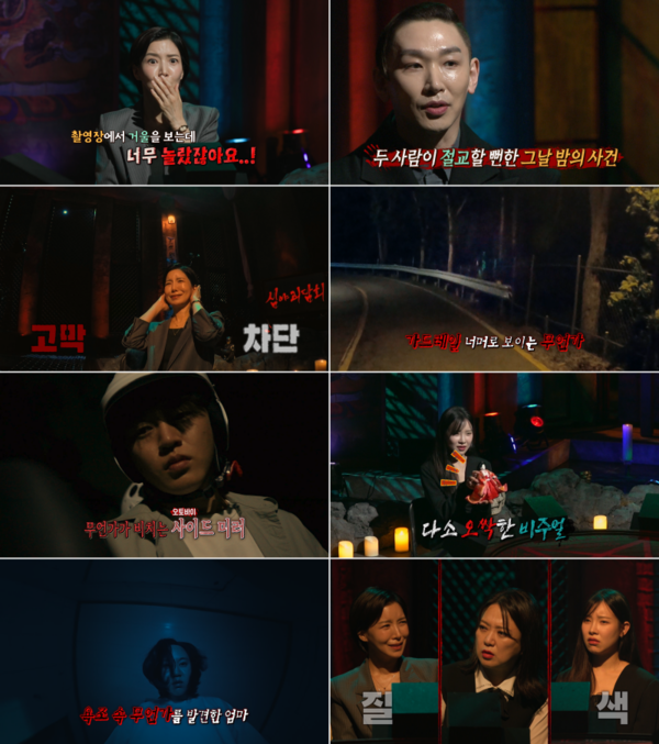 ⓒMBC'심야괴담회5'[스포츠한국신영선기자]'심야괴담회5'에배우윤세아가출연한다.6일방송되는MBC'심야괴담회5'에서는2005년공포미스터리영화'혈의누'로데뷔해공포영화'궁녀',스릴러영화'해빙'에이어오는9월개봉예정인호러영화'홈캠'에출연한윤세아가괴스트로등장한다.실제로는혼자공포영화를보지못한다는윤세아는'심야괴담회5'출연을앞두고도고민이많아촬영일주일전부터만반의준비를했다고한다.실제로한여름촬영임에도혹시모를오한방지를위해겨울옷까지챙겨온그는이런준비에도불구하고괴담을한줄한줄들을때마다무서움을참지못하고수십번괴성을지르며진땀을뺐다.심지어촬영중갑자기자리를박차고뛰쳐나가기도했다는데알고보니그의눈앞에하얀형체가아른대고있었다고.윤세아는오는9월개봉하는공포스릴러영화'홈캠'을촬영하며믿기힘든일을겪었다고한다.자문을맡은무당이경고했던'금기'가있었는데호기심에이금기를어긴스태프가있었던것.그런데해당스태프는촬영도중응급실에실려갔다고해MC들을깜짝놀라게했다.윤세아는또촬영내내거울만보면소름돋는존재가보여거울을제대로볼수없었다고전한다.믿기힘든윤세아의오싹한에피소드들은'심야괴담회5'를통해확인할수있다.한편이날'심야괴담회5'에는어느밤고등학교친구와고개를넘다가10년우정이깨져버린남자이야기'솔치고개',자꾸내딸을노리는정체모를귀신과의사투'내딸성이',일본의한시골마을에서일어난소녀인형의저주'히나마츠리'등의괴담들이소개될예정이다.'심야괴담회'시즌5는전국민을대상으로무섭고기이한이야기들을메일과공식홈페이지를통해투고받는다.방송에소개되는모든공모작은상금44만4444원의액땜상금을획득하며어둑시니(랜선방청객)들의촛불투표를통해1등을한공모작에게는추가상금의기회가주어진다.'심야괴담회5'2회는6일밤11시에방송된다.스포츠한국신영선기자[email protected]©스포츠한국.무단전재및재배포금지.