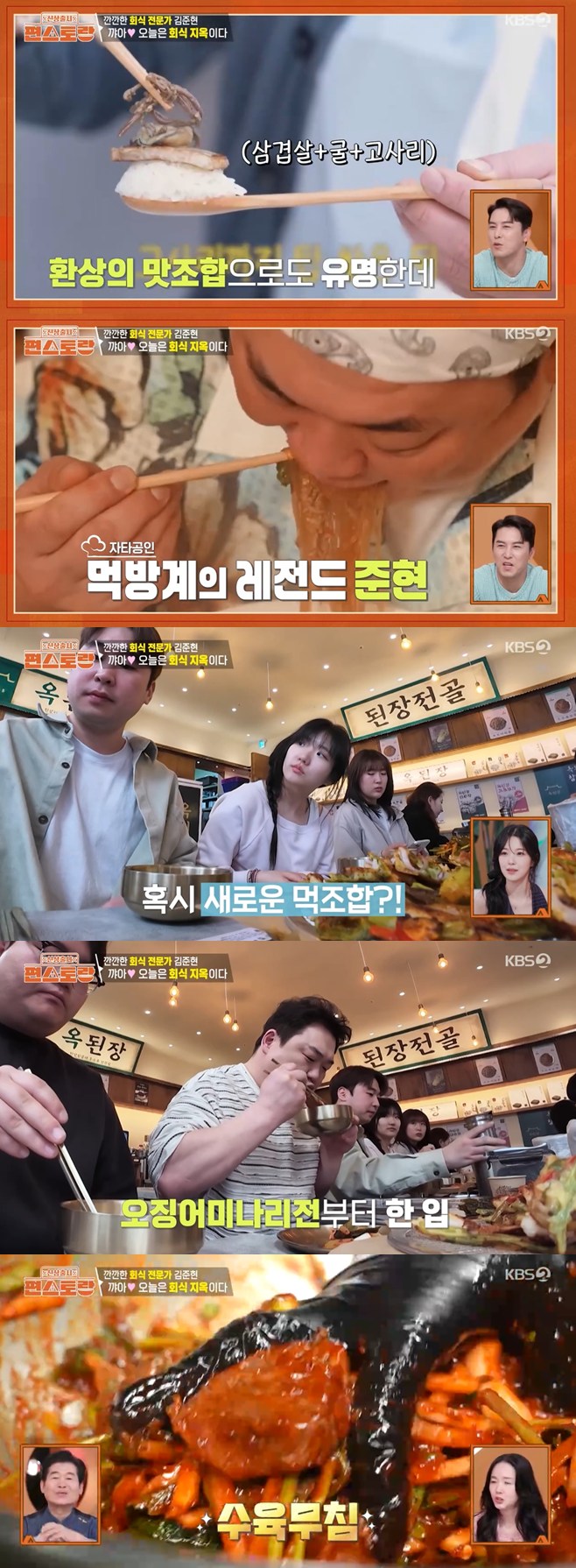 티브이데일리포토[티브이데일리이기은기자]‘편스토랑’김준현,수육의제왕이었다.4일저녁방송된KBS2예능프로그램‘신상출시편스토랑’에서는‘먹방’개그맨김준현회식지옥현장이공개됐다.무엇보다먹는게중요한김준현은이날스태프들을불러모아놓고회식자리를가졌다.오로지먹기위해사는남자였다.그는이야기를하다가맛있는메뉴가나오자스태프들에게“일동조용히!”를외치며,음식에집중하기시작했다.그는수육무침에오징어미나리전을맛있게싸먹는환상의‘먹방조합’을선보였다.이에장민호,붐역시“이건꿀조합”이라고엄지를치켜세웠다.@1급기야그는마른김에수육무침을싸먹으며식재료조합을일일이젊은스태프들에게알려줬다.효정은“약간교수님과제자들같다”라고감탄했다.이윽고그는김,밥,수육무침을함께싸먹으며미식을즐겼다.이윽고메인수육이등장했다.그의압도적인소꼬리전골‘먹방’이금요일저녁시청자들의침샘을제대로자극했다.@1[티브이데일리이기은기자[email protected]][Copyrightⓒ*세계속에新한류를*연예전문온라인미디어티브이데일리(www.tvdaily.co.kr)/무단전재및재배포금지]Copyright©티브이데일리.무단전재및재배포금지.