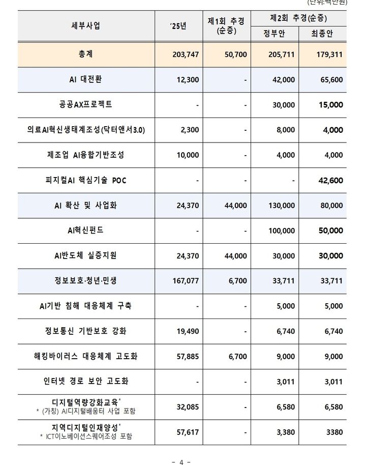 국회본회의통과…500억규모AI혁신펀드도추가조성공공·의료분야에AI접목…국내AI반도체팹리스육성추진[서울=뉴시스]과학기술정보통신부는4일열린본회의에서총1793억원규모의인공지능(AI)분야제2차추가경정예산안이의결됐다.(사진=과기정통부제공)*재판매및DB금지[서울=뉴시스]심지혜기자=과학기술정보통신부는4일열린본회의에서총1793억원규모의인공지능(AI)분야제2차추가경정예산안이의결됐다고밝혔다.과기정통부는이번추경으로공공·의료·제조분야에AI를접목하는‘AI대전환’에속도를낼계획이다.우선656억원의예산으로공공부문에AI접목을위한‘공공AX프로젝트’,AI기반의료예후관리서비스개발,제조업의기술고도화를위한AX실증플랫폼구축,피지컬AI핵심기술실증사업등을지원한다.공공AX프로젝트는AI활용수요가있는부처와민간기업이협력해부처의수요와데이터를기반으로기업이AI솔루션을개발·실증하는방식이다.개발된AI솔루션은추후수요부처와의협의를통해현장도입및확산을추진한다.피지컬AI에대한글로벌기술확보경쟁이심화되는상황에서피지컬AI원천기술을조속히확보하기위한현실데이터수집체계구축,AI모델설계등의기반조성도지원한다.AI의산업화및사업화확대를위한투자도강화한다.올해본예산과지난1차추경을통해확보한AI혁신펀드외에500억원규모의AI혁신펀드를추가로조성해민간의적극적인투자를유도하고,AI분야초기창업기업을비롯한유망기업을육성할방침이다.국산AI반도체(NPU)분야역시조기상용화지원을위한1차추경에이어2차추경에도지속적인의견수렴과정에서추가로발굴한수요를사업화해반영했다.이번에는최신AI모델과의호환성확대및설계에필수적인고비용설계지식재산권(IP)활용등제품고도화를지원해기업들의수요처확보에실질적인도움을제공할계획이다.주요정보통신기반시설대상고위험취약점관리체계구축과함께고위험산업군대상정보보호관리체계특화인증항목을개발해국가중요시설등의보호·점검수준도강화한다.신속한사이버침해사고분석·대응을위한생성형AI기반의침해대응체계를구축하고대규모인터넷장애방지를위해인터넷경로보안체계(RPKI)를구축한다.AI디지털배움터를구축하고청년대상맞춤형AI·소프트웨어(SW)교육도확대한다.유상임과기정통부장관은"이번2차추경은공공,산업,민생전반에서인공지능이실질적인혁신을이끌도록가장시급히추진해야하는사업중심으로편성했다"며"정부는1차추경에서확보한핵심인프라를바탕으로,2회추경을통해AI대전환을더욱속도감있게뒷받침할것"이라고말했다.☞공감언론뉴시스[email protected]©뉴시스.무단전재및재배포금지.