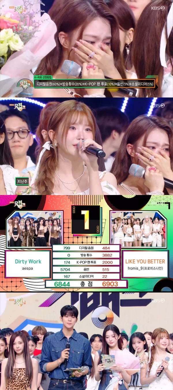 사진=KBS2[스포츠투데이김태형기자]그룹프로미스나인이'뮤직뱅크'7월첫째주1위를차지했다.4일방송된KBS2'뮤직뱅크'에는에스파'더티워크(DirtyWork)'와프로미스나인'라이크유베터(LIKEYOUBETTER)'가1위후보에올랐다.집계결과프로미스나인'라이크유베터(LIKEYOUBETTER)'가디지털음원484점,방송횟수3882점,K팝팬투표2000점,음반515점,소셜미디어22점총점6903점으로1위에올랐다.에스파'더티워크(DirtyWork)'는총점6844점으로2위를기록했다.프로미스나인은"저희가어센드라는회사에서새롭게함께하게됐는데하나부터열까지잘챙겨주셔서정말감사하고한마음으로모여준멤버들에게도감사하다.생각못했는데이렇게1위를시켜준플로버(팬덤명)분들도감사드린다.열심히하는프로미스나인되겠다.감사하다"라며눈물을흘렸다.한편이날방송에는한승우,캐치더영,위시,원호,원어스,아일릿,박지현,딕펑스,리센느,누에라,에스파,베이비돈크라이,블링원,크래비티,프로미스나인,하이키,카드,르세라핌,아홉등이출연했다.[스포츠투데이김태형기자[email protected]]Copyright©스포츠투데이.무단전재및재배포금지.