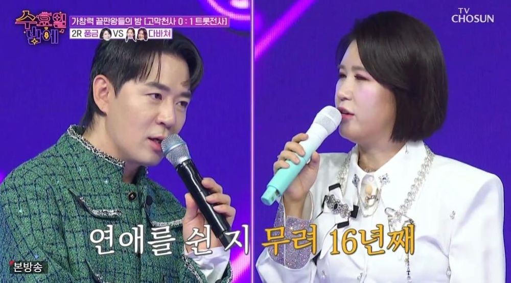 [TV리포트=한수지기자]가수풍금이16년째남자친구가없다고고백했다.2일방송된TVCHOSUN'트롯올스타전:수요일밤에'11회에서는'가창력끝판왕'특집으로'미스트롯2진(眞)'양지은,'미스트롯3'풍금,국악인박애리,'원조국악트롯'유지나가스페셜게스트로출연했다.이날붐은가수풍금을소개하며김분금이라는본명을공개했다.풍금은"본명을왜이야기하냐,부끄럽게"라면서도별명은'금붕어'라고밝혔다.이어풍금은'다바쳐'정서주,정슬을대결상대로지목했다.그는지목한이유에대해"제가원조리틀이미자였는데서주에게뺏겼다.제가다시가져오기도그렇고같이쓸까싶다.친해지고싶어서골랐다"라고설명했다.정슬에대해서는"고막여친이라고하더라.제가남자친구가생기고싶어골랐다.제가연애를16년쉬고있다"라고고백해놀라움을자아냈다.이를듣던정슬은서주를보며"거의네(정서주)나이다"라며놀라워했다.붐은연애를쉰이유를물었고,풍금은"제가들이대니까다도망가던데?"라고의아해했다.이에붐은"인사를하자마자나랑사귈래?이러면안된다"라고꼬집었다.이를듣던인생선배유지나는"남자들이뭐라고하면'죄송한데저잘몰라요'라고내숭을떨어야한다"라는현실조언으로웃음을자아냈다.풍금은나훈아의'사모'를선곡하며"이곡을부르면16년만에누군가가나타나지않을까,노래하는모습을보고받아줄지도모르지않냐"라고기대에부풀었다.평소엉뚱한모습과는달리풍금은노래가시작되자마자180도다른모습으로감탄을안겼다.가슴을울리는풍금의애절한목소리에관객석에서도환호가터져나왔다.이를본멤버들은"풍금콘서트같다""진짜울렸다"라며감탄했다.유지나는"나무랄데가없이노래를잘한다.남자만잘만나면된다"라고칭찬했고,박애리는"이방송나가자마자남자들한테연락이쇄도할거같다"라고말해풍금을설레게했다.이에풍금은"그런마음으로노래를세게불렀다"라고너스레를떨었다.반면다바쳐는최진희의'천상재회'로맞붙었다.두사람의아름다운하모니에풍금은"노래도가사도너무예뻤다.금방이라도눈물을흘릴거같았다"라고칭찬했다.풍악평가단의투표결과'다바쳐'정서주,정슬이183점을받으며,173점을받은풍금을10점차이로꺾었다.결과를듣고달려온나상도는"누나아무말하지말고노래했으면190점이었을것"이라고팩폭을날려폭소를유발했다.한편,가수풍금은1982년생으로올해나이42세며,'미스트롯3''헬로트로트''트롯신이떴다2-라스트찬스'등에출연하며얼굴을알렸다.한수지기자[email protected]/사진=TVCHOSUN'트롯올스타전:수요일밤에'Copyright©TV리포트.무단전재및재배포금지