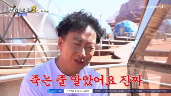 [스타뉴스|김정주기자]/사진=MBCevery1'위대한가이드2'방송화면개그맨박명수가노장투혼을발휘했다.1일방송된MBCevery1'위대한가이드2'에서는세계7대불가사의'페트라'도심에입성한박명수,김대호,최다니엘,이무진의모습이그려졌다.이날사형제는가이드의추천으로페트라의마지막코스인'알데이르'등반에나섰다.이들은페트라의하이라이트로꼽히는알데이르등반에흥분된표정을지었으나눈앞에나타난800여개의계단을마주하자당혹감에입을다물지못했다.박명수는"800개돌계단인데완전생돌이다"라며한숨을쉬었고,최다니엘역시"바람에모래도날리고,나귀도지나가서쉽지않았다"라고극한의상황을회상했다.반면김대호는흥얼흥얼노래를부르며"봐도봐도신기하다"라고연신감탄사를내뱉었다.그는고대나바테아인들의거주흔적을살펴보며"이런데서다살았다는거아니야.왜이런데서살았을까.농작물을키우기좋은것도아니고물이항상흐르는것도아닌데"라고궁금증을토로했다.끝도없이이어진돌산에박명수는점점표정을일그러뜨리며"아니왜수도원을이렇게힘든데만들어놨어"라고푸념해웃음을자아냈다./사진=MBCevery1'위대한가이드2'방송화면한참뒤처진최다니엘역시가쁜숨을몰아쉬며실소를터뜨려모두를폭소케했다.그는정신줄을놓은듯웃음을터뜨리더니"나벌써힘든데어떡하지?"라고울상을지었다.김대호와발맞춰가던이무진은"제가그래도체력이없는편이아닌데힘들었다.대호형이잘가니까힘이된다"며"앞에대호형엉덩이보면서따라갔다"고털어놨다.한편최약체로꼽혔던박명수는불평불만을쏟아내면서도발걸음을멈추지않았다.그는얼굴이아닌하늘로향하는카메라앵글을보며"카메라들힘도없었다.이렇게인생마감하는구나싶었다"고지친기색을내비쳤다.심지어제작진을향해"PDXXX"라고육두문자를퍼부어모두를폭소케했다.이를보던김대호는"명수형님은정신력으로가신다"며"어느정도시간이지나고동공에힘이없었다.정신력이신체를지배한거다"라고노장투혼을추켜세웠다.김정주기자[email protected]©스타뉴스&starnewskorea.com,무단전재및재배포금지