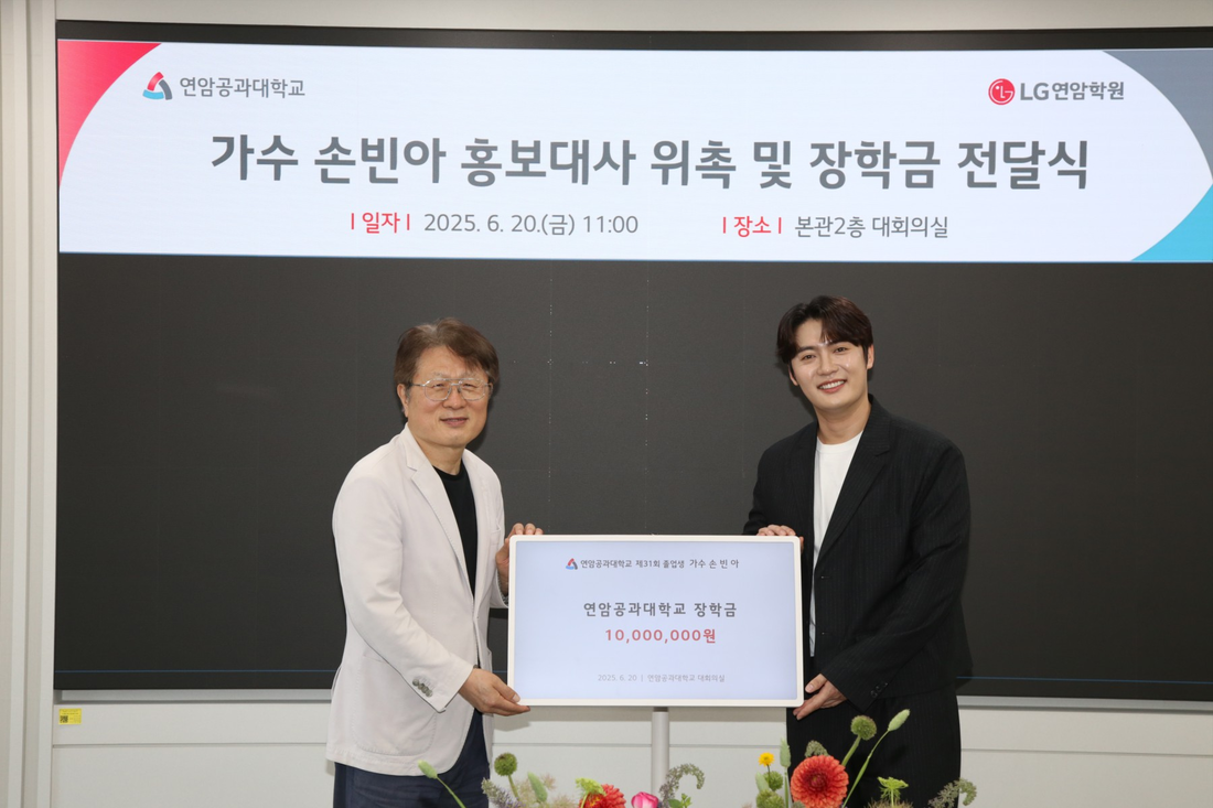 연암공과대학교안승권총장과손빈아(오른쪽).유선수엔터테인먼트손빈아가연암공과대학교의공식홍보대사로위촉됐다.연암공과대학교(총장안승권)은오늘20일“본교제31회졸업생이자,TV조선‘미스터트롯3’에서‘선(善)’에오른가수손빈아를공식홍보대사로위촉한다”고밝혔다.이번위촉은지난5월23일,연암미래관특설무대에서열린‘연암공대-손빈아지역사회와함께하는열린콘서트’의성공적인개최를계기로이루어졌다.손빈아는지난콘서트에서연암공대재학생과교직원,지역주민등약1,000여명이참석한가운데,진정성있는무대와솔직한인터뷰를통해관객들과활발히소통했다.특히,졸업생으로서의추억을담은VCR영상과관객들의손피켓퍼포먼스,커피차및포토존등다채로운부대행사가더해져연암공대의축제인서당대동제의분위기를한층풍성하게만들었다.연암공과대학교안승권총장과손빈아(오른쪽).유선수엔터테인먼트손빈아는홍보대사임명과동시에,연암공대재학생을위한장학금1,000만원도기부했다.이장학금은꿈과열정을가진학생들에게전달될예정으로,임명식과동시에장학금전달식이함께진행되어따뜻한감동을더했다.연암공대관계자는“손빈아졸업생의진심어린참여와팬들의긍정적인반응을통해대학과지역사회가함께성장할수있는가능성을확인했다”며“이번홍보대사위촉을계기로다양한홍보활동을추진해나갈계획”이라고밝혔다.홍보대사로위촉된손빈아는“모교가늘자랑스러웠고,이제는저도연암공대의이름을알리는데함께할수있어기쁘다”며“지역과대학이더가까워지는데조금이나마보탬이되고싶다”고소감을전했다.앞으로손빈아는연암공대의공식홍보콘텐츠,학교행사,지역연계사업등다양한분야에서활동하게되며,연암공대의친근하고개방적인이미지를확산하는데기여할예정이다.안병길기자[email protected]©스포츠경향.무단전재및재배포금지.