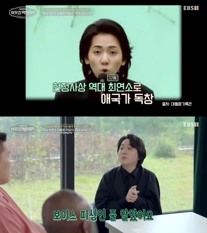 ‘서장훈의이웃집백만장자’.사진IEBS1‘서장훈의이웃집백만장자’방송캡처성악가임형주가고(故)노무현대통령취임식무대에서게된비하인드를전했다.25일방송된EBS1,E채널‘서장훈의이웃집백만장자’에는임형주가게스트로출연했다.이날임형주는고노무현대통령취임식에서헌정사상역대최연소인17세의나이로애국가를독창한것에대해“고노무현대통령이그때당시젊고참신하고새로운정부를내세우지않았냐.권위적이었던애국가를17살소년에게한번맡겨보자싶었다고했다.그안에서도너무설왕설래가많았다고하더라.‘너무어리다’,‘조수미,김동규도아닌임형주가누구냐’고했다더라”라고말했다.이어“취임식2주전에연락이왔다.그정도로나를반대하는사람이많았던거다.그래서처음에보이스피싱인줄알았다”고털어놨다.임형주는“너무떨렸다.그때사시나무떨듯떨었던것같다.그런데그때는뭘잘모를때라부담감도부담감이지만빨리나가서뭔가를보여주고싶었다.나를증명해보이고싶었다”고미소지었다.[이세빈스타투데이객원기자]Copyright©스타투데이.무단전재,재배포및AI학습이용금지