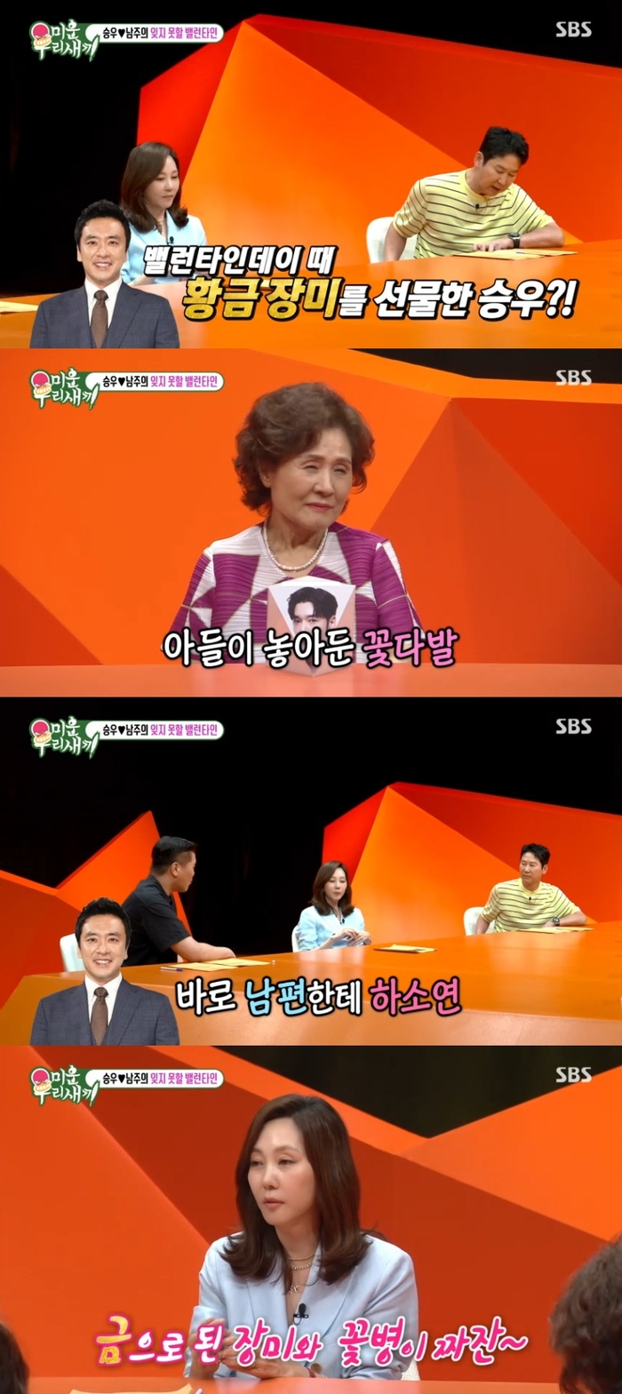 ‘미운우리새끼’사진|SBS김남주가남편김승우한테황금장미를받았다고고백했다.29일오후방송된SBS예능프로그램‘미운우리새끼’(이하‘미우새’)에는배우김남주가출연했다.이날방송에서신동엽은“밸런타인데이때황금장미를선물했다고요?”라고김남주에게물었다.이에김남주는“아들이집에꽃을놓아둔거예요.저는제것인줄알았는데좀이따없어진거예요.아들한테전화해봤는데친구한테주려고산거래요”라고했다.이어“제가오랜만에심술이나서남편한테‘’오빠밸런타인데이인데꽃도안사줘?”라고했더니다음날뭘부스럭부스럭뜯더니금으로된장미와금으로된꽃병을주는거예요.그러면서‘시들지않는꽃을사주마’이랬어요“라고덧붙였다.김남주는“20년같이살면서그렇게취향을모르나...난생화가좋은데”라며아쉬워했다.일요일오후9시5분SBS에서방송된다.[서예지스타투데이객원기자]Copyright©스타투데이.무단전재,재배포및AI학습이용금지