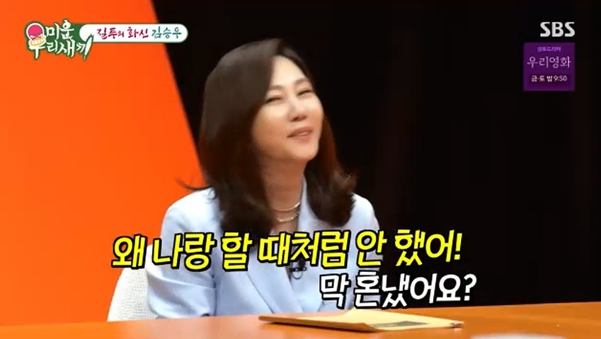 (엑스포츠뉴스오승현기자)김남주가김승우의질투심을폭로했다.29일방송한SBS'미운우리새끼'(이하'미우새')에서는게스트로출연한김남주가김승우의멜로신질투를언급했다.김남주는앞서이상민의재혼소식에기쁨을표했다.그는이상민과이혜영의결혼식에서부케를받았다며"재혼한모습을보니좋다.제친구도잘살고있다.저도항상TV보며안타까웠는데(재혼에)기뻤다"는진심을전했다.신동엽은"이제더이상그분이야기안하겠구나싶었나"라고장난을치며"저번에김승우가(미우새에)나왔을때도첫번째사회를제가봤고(김남주가)부케를받았다"는이야기를꺼냈다.이에김남주는"그만(언급)해라"고짚어웃음을안겼다.또한김남주는남편김승우에대해"질투가되게심하다.제가키스신,멜로신이있다면조용히사라진다.안본다"고이야기했다."본인도배우인데그러나"라는말에김남주는"근데전완전반대다.저는남편의키스신이어색해서좀다시찍으라고했다.연기는연기일뿐인데남편은질투가있다"고덧붙였다.신동엽은"질투가귀엽냐"고물었고,김남주는"이해가안간다.같은연기자인데"라며단호히답해웃음을자아낸다.이어그는"김승우가유독화낸애정신이있나"라는질문에"화까지는아닌데'미스티'가격정멜로니그걸제일싫어했다"고덧붙여김승우의사랑을실감케했다.사진=SBS오승현기자[email protected]©엑스포츠뉴스.무단전재및재배포금지.