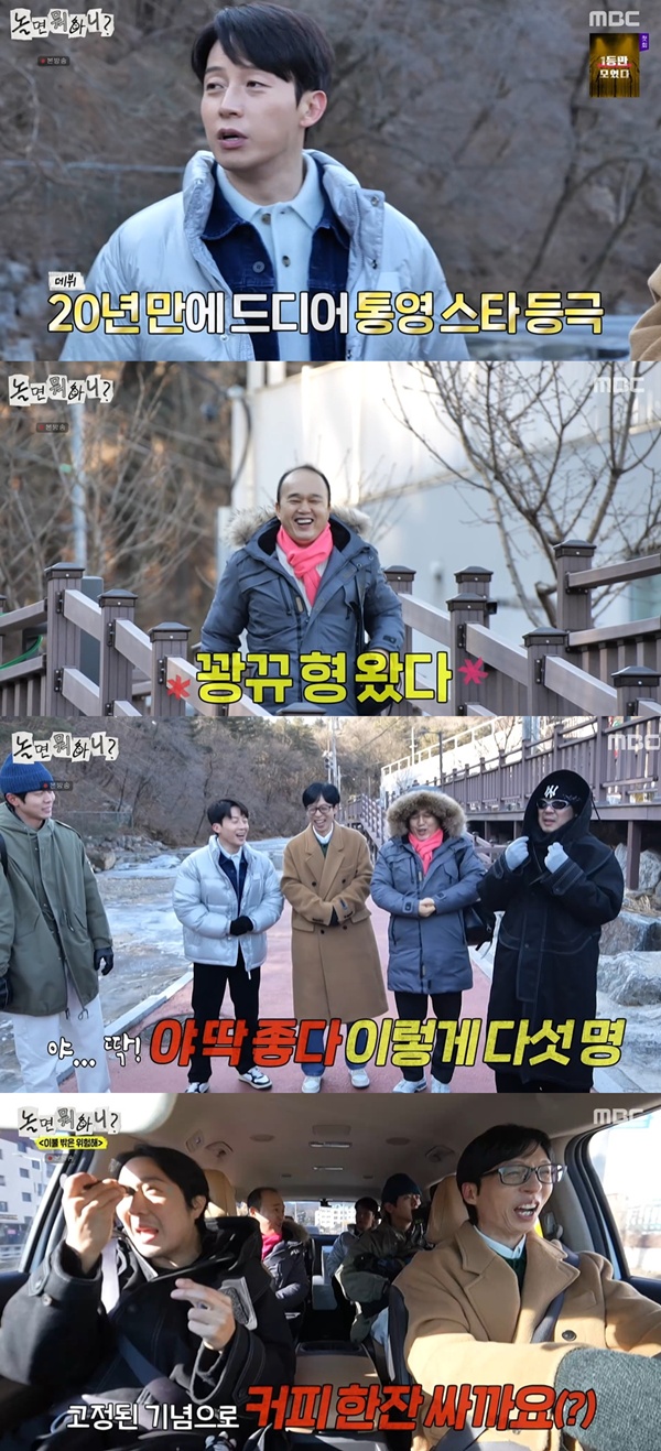 티브이데일리포토[티브이데일리김진석기자]'놀면뭐하니?'김광규가고정욕심을드러냈다.7일방송된MBC예능프로그램'놀면뭐하니?'에선'이불밖은위험해'특집이펼쳐졌다.이날허경환은"내가'놀면뭐하니'나오니까통영에서친구들이연합을해서막선물을올려보낸다.너무많이실어가지고앞바퀴가들렸다"라고너스레를떨었다.이어김광규도등장했고,그는"딱좋다이다섯명"이라며고정멤버합류를어필해웃음을더했다.차를타고이동하던도중유재석은근처카페를보며"여기서따뜻한거한잔먹으면좋겠다"라고말했고,이를놓치지않은김광규는"제가고정된기념으로커피한잔쌀까요"라고말해폭소를자아냈다.'살까요'와'쏠까요'를고민하던중두말이섞여서입밖으로나온것.김광규는"우리엄마가왜자꾸재석이한테얻어먹냐고하더라"라며계산을해웃음을안겼다.김경규는"빵은사지마라","나와라나계산하는거찍고있지않냐"등의멘트로분위기를이끌었다.[티브이데일리김진석기자[email protected]/사진=MBC'놀면뭐하니']놀면뭐하니[Copyrightⓒ*세계속에新한류를*연예전문온라인미디어티브이데일리(www.tvdaily.co.kr)/무단전재및재배포금지]Copyright©티브이데일리.무단전재및재배포금지.