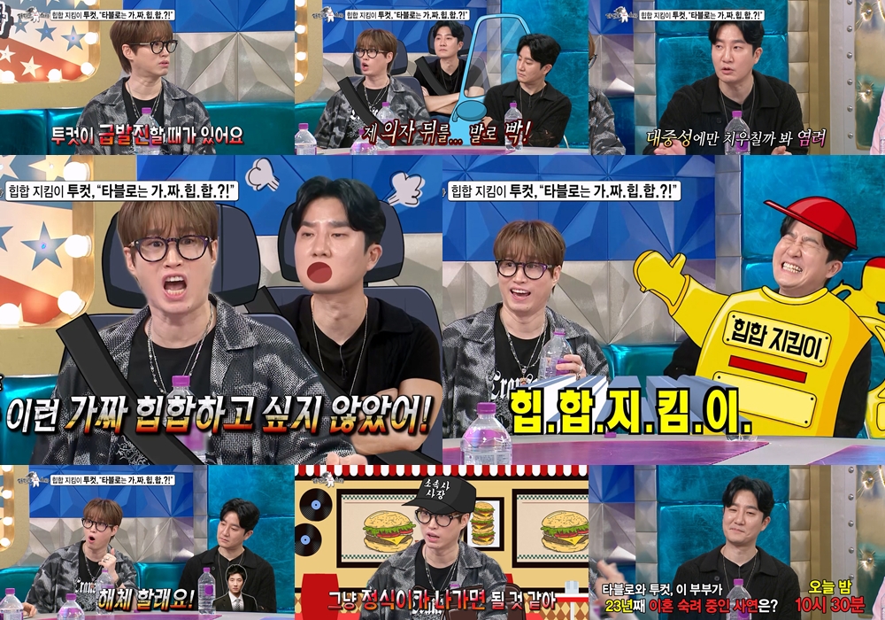 ‘라디오스타’에출연한에픽하이타블로,투컷이끊임없는티격태격케미를뽐낸다.특히타블로는데뷔초‘힙합지킴이’를자처한투컷의급발진에에픽하이가해체(?)할뻔한에피소드를공개해이목을집중시킨다.iMBC연예뉴스사진오늘(2일)방송되는MBC‘라디오스타’(기획강영선/연출김명엽,황윤상,변다희)는‘너튜브스타’특집으로,타블로,투컷,임우일,김원훈이출연한다.방송에앞서공개된영상에서그룹에픽하이타블로와투컷이23년차티격태격케미를뽐내눈길을모은다.타블로는“투컷이갑자기급발진할때가있어요”라며데뷔초다투었던에피소드를공개한다.타블로는에픽하이의데뷔앨범이주목을받지못해이후“대중에게가까이갈수있는곡을썼다”라며‘평화의날’을언급한다.‘평화의날’이데뷔이래최대치의반응을받으며본격적으로에픽하이의이름을알리게된것.그러나‘평화의날’활동중유독투컷이퉁명스러운반응을보였다고.이에의아한타블로가차안에서투컷에게“활동에불만있냐?”라고물었는데,뒤에앉아있던투컷이의자를발로차며“가짜힙합하고싶지않았어!”라고외쳤다고해스튜디오를웃음바다로만든다.이에투컷은머쓱한표정으로당시의속마음을밝히며해명한다.그룹정체성형성의시기에대중성에만치우쳐질까염려했던것.타블로는“투컷은힙합을지켜야하는‘힙합지킴이’다”라고놀려폭소를자아낸다.또한타블로는투컷이소속사사장님에게전화를걸어“저에픽하이못하겠습니다.저이팀안할래요.해체할래요”라고탈퇴를선언했다고전하기도.한달음에달려온소속사사장님은투컷의말에“해체할필요까진없고정식(투컷)이만나가면될것같아”라는반응을보였다고해웃음을유발한다.23년째티격태격중인에픽하이타블로와투컷의에피소드는오늘(2일)수요일밤10시30분에방송되는‘라디오스타’의‘너튜브스타’특집을통해확인할수있다.‘라디오스타’는MC들이어디로튈지모르는촌철살인의입담으로게스트들을무장해제시켜진짜이야기를끄집어내는독보적토크쇼로많은사랑을받고있다.iMBC연예유정민|사진출처MBCCopyright©MBC연예.무단전재및재배포,AI학습금지.