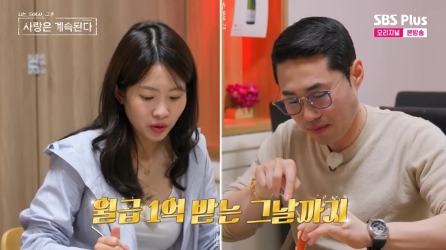 ENA,SBSPlus‘나는SOLO,그후사랑은계속된다(나솔사계)’캡처ENA,SBSPlus‘나는SOLO,그후사랑은계속된다(나솔사계)’캡처[뉴스엔서유나기자]25기영수의진중함어필이24기정숙에게통했다.7월3일방송된ENA,SBSPlus예능'나는SOLO,그후사랑은계속된다(나솔사계)'120회에서는네번째'한번더특집'이이어졌다.이날24기정숙과사계데이트를나선25기영수는좀처럼아이콘택트를하지못했다.25기영수는24기정숙이"영수님귀엽다.눈을잘못마주치네"라고이를언급하자"저는좋아하면눈을못본다.눈을하도못마주친다고해서노력한건데보다보면자꾸시선이(다른곳으로간다)"고털어놓았다.24기정숙은이런25기영수를향해대놓고"귀엽다"고말하더니"쉴때뭐하냐"고물었다.25기영수는"주말에도일한다"며본인의휴대전화스케줄표를보여주곤"제한달스케줄이다.안채우면불안하다"고밝혔다.이어"빠른나이에빨리더성장하고싶어서하루하루시간이없다고생각한다.월급1억원이목표라서그때까지열심히하려한다.전말의힘을믿는다.그래서농담도잘안한다.거짓된걸안좋아한다.'보고싶어.내일보자'라고하면'지금가.내일도또올게'라고하는스타일"이라고본인어필을했다.25기영수의어필은24기정숙에게통했다.24기정숙은추후개인인터뷰에서"사실진중하지않은사람인가,모두를챙기려고하고본인을희생하면서까지분위기를띄우려고하고남을더챙겨주려는배려가몸에배어있는사람같아서그런생각을했는데1대1로대화를나눠보니'마냥장난기만있는사람은아니다.굉장히진중한모습도있는분이다'싶더라.원래순위가1위25기영호님,2위24기영수님,3위25기영수님이었는데순위를따지면2위로올라오셨다"고밝혔다.한편1991년생25기영수는한국예술종합학교출신의성악가다.현재는보험회사본부장으로일하고있다.'나는솔로'출연당시월급이3,4천만원에연봉이약5억원이라며"내년목표는월급1억이다.가능할것같다"고밝혔다.뉴스엔서유나stranger77@기사제보및보도자료[email protected]ⓒ뉴스엔.무단전재&재배포금지Copyright©뉴스엔.무단전재및재배포금지.