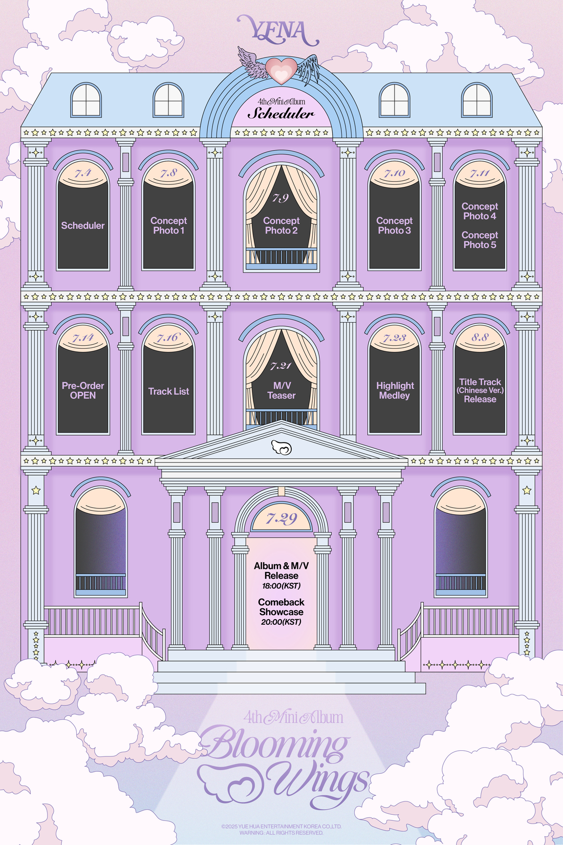 위에화엔터테인먼트가수최예나가컴백카운트다운을시작했다.최예나는4일SNS를통해네번째미니앨범‘BloomingWings(블루밍윙스)’의스케줄러포스터를공개했다.스케줄러포스터는하늘위에떠있는듯한건물과구름,별을일러스트로담아내며판타지스러운분위기를자아낸다.전체적으로몽환적이고동화같은감성이조화를이루며신비로운여운을남긴다.지난2일커밍순티저를공개하며컴백을공식화한최예나는오는8일부터11일까지콘셉트포토를순차적으로오픈한다.이어14일앨범예약판매를시작한뒤트랙리스트,뮤직비디오티저,하이라이트메들리등을잇달아공개하며컴백열기를끌어올린다.29일에는앨범발매및컴백쇼케이스를열고팬들과만난다.컴백이후인8월8일에는새타이틀곡을중국어버전으로발매할계획이다.최예나는지난해9월발매한세번째싱글‘네모네모’이후10개월만의공백을깨고가요계에돌아온다.전작에서중독성강한멜로디와퍼포먼스로대중의이목을사로잡았던최예나는이번앨범에서가장예나다운모습으로선보이는사랑과성장서사를가득담은곡들을통해자신만의색깔을더욱확고히다져갈예정이다.음악뿐아니라연기,예능,광고등다방면에서활약중인최예나는최근주류광고모델로도발탁되며주목을받았다.이번앨범을통해다시금본업인음악으로돌아오는최예나는진정성있는메시지를전하며‘젠지아이콘’다운존재감을보여줄것으로기대된다.최예나네번째미니앨범‘BloomingWings’는29일오후6시각종음원사이트를통해발매된다.손봉석기자[email protected]©스포츠경향.무단전재및재배포금지.