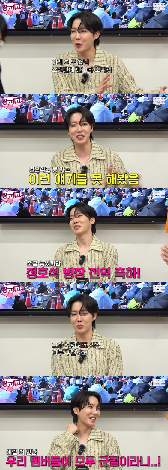 [스타뉴스|최혜진기자]제이홉/사진=유튜브뜬뜬핑계고그룹방탄소년단(BTS)제이홉이방송인조세호의결혼식에불참한이유를밝혔다.5일유튜브채널'뜬뜬'의웹예능'핑계고'에는제이홉이게스트로출연했다.이날제이홉은조세호에게"요즘결혼생활은어떠냐"고물었다.조세호는"너무좋다"라고수줍게답했다.제이홉은"형님오랜만에만나다보니까이런얘기를할수있는(시간이없었다)"며"결혼식도못갔다.전역시점이랑겹쳤다"고설명했다.유재석은제이홉에게"시간이꽤지나긴했지만군생활마치니어떠냐"고질문했다.제이홉은"후련하다.나름또의미도있었다.1년반동안본업을내려놓고군이라는사회에맞춰서임무를한것자체가인간정호석(제이홉본명)으로서배울게많았다"고밝혔다.또한제이홉은"이제멤버들도다전역했다.저도신기하다.'BTS가군대를다다녀오네'(생각한다)"고전했다.최혜진기자[email protected]©스타뉴스&starnewskorea.com,무단전재및재배포금지