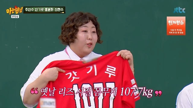 JTBC‘아는형님’캡처JTBC‘아는형님’캡처[뉴스엔서유나기자]코미디언신기루가정용진회장에게선물받은야구유니폼을자랑했다.7월5일방송된JTBC예능'아는형님'(이하'아형')489회에서는홍윤화,추신수,신기루,신현수가형님학교로전학을왔다.이날랜더스팬인신기루는야구유니폼덕분에정용진회장과연이닿은사연을털어놓았다.시중에나와있는유니폼이사이즈가작아구매하지못한뒤채널을통해공개적으로"정용진구단주님옷을조금만크게만들어주시면좋겠다"고청했는데답이왔다는것.신기루는"보시고소셜계정에'당장진행시키겠습니다'라고올리셨다.며칠후구장자체에도한사이즈더큰유니폼을갖다놓으셨고따로개인적으로보내주셨다.이름도뒤에박아주셨다"고자랑했다.공개된유니폼에서는107.7이라는등번호가눈길을끌었다.형님들이"몸무게박은거냐"고묻자신기루는"옛날리즈시절몸무게"라고밝혔고형님들은"라디오주파수인줄알았다"며웃음을빵터뜨렸다.홍윤화는"107.7일때제일예쁘다고하더라"고신기루가자주하는말을전했다.뉴스엔서유나stranger77@기사제보및보도자료[email protected]ⓒ뉴스엔.무단전재&재배포금지Copyright©뉴스엔.무단전재및재배포금지.