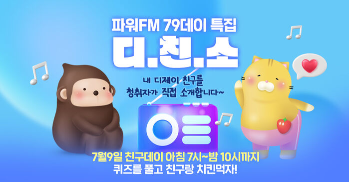 [SBS연예뉴스|강선애기자]SBS라디오파워FM(107.7MHz)이오는9일'친구데이'를콘셉트로청취자들을위한'내디제이친구를소개합니다-디.친.소'특집을진행한다.이번특집은오전7시부터오후10시까지,'김영철의파워FM'부터'웬디의영스트리트'까지생방송으로이어진다.청취자들은직접자신이좋아하는DJ를애정어린멘트로소개하며참여할수있고,퀴즈쇼형식으로더욱풍성한재미와감동을선사할예정이다.퀴즈에참여한정답자및재치있는오답자들에게는추첨을통해수백개의치킨선물을증정한다.2025파워FM'친구데이'특집'디.친.소'는SBS파워FM107.7MHz와전용앱'고릴라'를통해만나볼수있다.강선애기자[email protected]©CopyrightⓒSBS.Allrightsreserved.무단전재,재배포및AI학습이용금지
