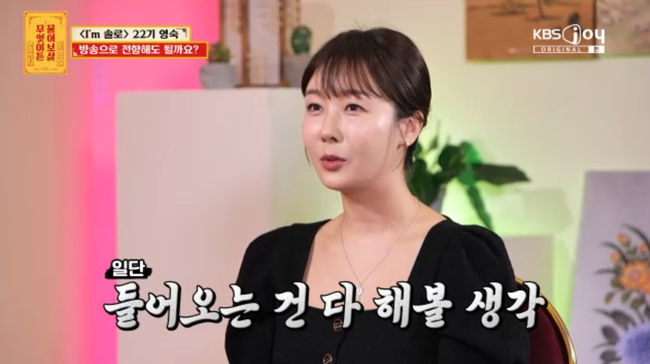 [스타뉴스|김노을기자]/사진=KBSJoy방송화면'나는솔로'22기영숙(가명)이연예계진출욕심을드러냈다.7일방송된KBSJoy예능프로그램'무엇이든물어보살'에는ENA,SBS플러스'나는솔로'22기영숙이출연했다.이날모습을드러낸영숙은'나는솔로'돌싱특집을비롯해'나는솔로,그후사랑은계속된다','지지고볶는여행'에출연한출연자.영숙은"34세양현지다.현재어머니와함께어린이집교사로일하고있다.계속방송에출연중이라방송쪽으로전향해야하나싶다"고고민을밝혔다./사진=KBSJoy방송화면그는"사실4~5년전이혼했다.결혼생활은2주간했다.저는천주교,상대방은개신교였는데시댁반대가심했다.결혼전상대방과상의를했지만갈등만더심해졌다.그래서상견례도없었고결혼식도안했다.혼인신고만했다.양가경제력차이가크다보니까신혼집을마련하는과정에서'다됐고,우리가알아서하겠다'해서신혼부부대출을받으려고혼인신고만먼저한것"이라고결혼및이혼과정을설명했다.이후서장훈이"'나는솔로'에서뭐가이슈가된거냐"고묻자영숙은"제가22기출연자중가장유명하다.'나사기캐야','나는내가아프로디테같다.(옷을)벗은게더낫다'같은유행어가몇개있다"고답했다.영숙은"어머니가운영중인어린이집이라언제든다시돌아갈수있다.그리고어릴때잠깐연기를배웠다"고당당하게말했다./사진=KBSJoy방송화면이에서장훈이"배우를하겠다는거냐.뭘하겠다는거냐"고질문하자영숙은"섭외가들어오면뭐든이것저것다하고싶다"고답했다.서장훈은"지금은'나는솔로'관련프로그램만출연하고있지않나.그런데문제는다른프로그램에서너를불러야하는거다.예를들어다른프로그램에나갔다고쳐도너한테네얘기를할기회를주지않는다"고조언했다.그러자영숙은"프로그램마다그때그때뭘할지는다다르겠지만저는제가나름대로잘할수있을거라고생각한다"고자신감을드러냈다.서장훈은"너보다잘하는사람이3만명이상있다.네가그사람들보다잘해야(제작진들이)너를쓰지않겠냐.'나는솔로'로인기를얻었다고해서다른프로그램에서도잘될거라고생각하면나중에현타가세게온다.진지하게고민해야한다"고강조했다.김노을기자[email protected]©스타뉴스&starnewskorea.com,무단전재및재배포금지