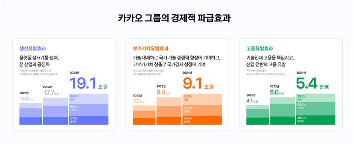 카카오그룹2024년도경제적파급효과분석결과발표부가가치유발9조1000억원,고용유발5만4000명기여올해그룹사회경제적가치,11개사122개지표로제시[서울=뉴시스]카카오는2024년도경제적파급효과분석결과를9일발표했다.지난해19조1000억원규모의생산유발효과,9조1000억원의부가가치유발효과,5만4000명의고용유발효과를창출한것으로나타났다.(사진=카카오제공)*재판매및DB금지[서울=뉴시스]윤정민기자=카카오가지난해19조1000억원규모의생산유발효과,9조1000억원의부가가치유발효과,5만4000명의고용유발효과를창출한것으로나타났다.카카오는이러한내용의2024년도경제적파급효과분석결과를9일발표했다.카카오는최근3년간누적경제적파급효과로생산유발효과51조4000억원,부가가치유발효과24조5000억원,고용유발효과약14만5000명에달했다고밝혔다.카카오는모바일메신저를시작으로문화콘텐츠,금융,모빌리티등다양한분야에서디지털생태계를구축해온결과라고설명했다.김용규한양대경제학부명예교수,전현배서강대경제학과교수,한종희연세대경제학부교수가카카오그룹의경제적파급효과를자문·감수했다.또카카오는올해사회경제적가치를설명한122개의지표도발표했다.지난해10개사의60개지표에서올해11개사의122개지표로분석범위를한층넓힌것이특징이다.카카오기부플랫폼'카카오같이가치'를통해조성된누적기부금은지난4월기준936억원에달했으며모금프로젝트수는1만9000개로나타났다.임팩트커머스'카카오메이커스'를통한판로지원으로제값을다한농축수산물은6859톤에달했다.'새가버치프로젝트'를통해새활용된물건은912만개를기록했다.이모티콘누적발신건수는2800억건,출시된이모티콘수는70만개로나타났다.[서울=뉴시스]카카오는자사서비스가창출한사회경제적가치를이용자·파트너·사회등이해관계자별기여가치기준으로10가지분야로구분해제시했다.(사진=카카오제공)*재판매및DB금지카카오는각사성과를나열하던방식에서나아가카카오서비스가창출한사회경제적가치를이용자·파트너·사회등이해관계자별기여가치기준으로10가지분야로구분해제시했다.구체적으로▲일상의편의제고▲사회안전망강화▲사회·환경문제대응▲국민건강관리▲소상공인성장▲디지털전환▲소프트파워생태계강화▲스타트업육성▲이용자경제부담완화▲경제격차해소등10개분야로구성했다.권대열카카오CA협의체ESG위원회위원장은"카카오그룹은이번에확인된10가지핵심분야를중심으로사회경제적가치를더욱확대해나가기위해노력할계획"이라며"특히카카오만의유익한소셜임팩트를보다폭넓게실현할수있도록사회및파트너들과더소통하고협력해나가겠다"고말했다.☞공감언론뉴시스[email protected]©뉴시스.무단전재및재배포금지.