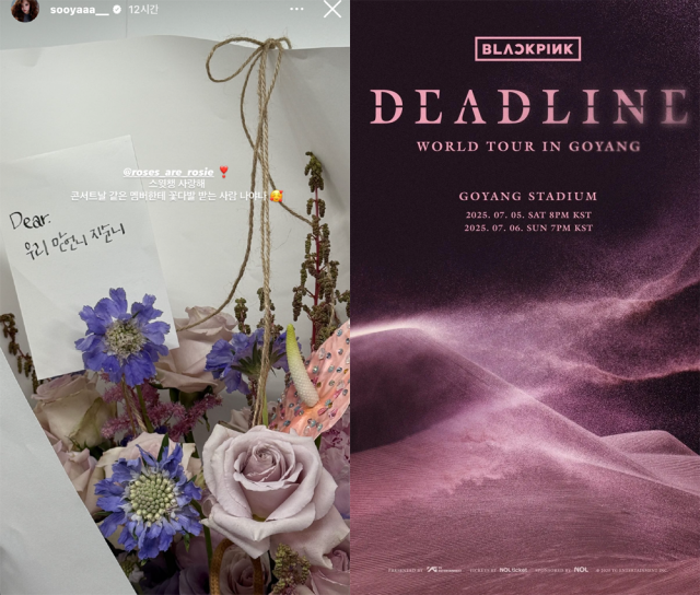 'BLACKPINKWORLDTOUR'월드투어진행중로제→지수·제니·리사…여전한멤버우정블랙핑크로제가지수에게꽃을선물했다&콘서트포스터./지수인스타그램&YG[마이데일리=신예지기자]그룹블랙핑크로제가콘서트당일멤버들에게꽃다발을선물하며변치않는우정을보여줬다.블랙핑크멤버들은6일각자의인스타그램스토리에로제가선물한꽃다발사진을자랑했다.가장먼저사진을올린것은지수였다.지수는"스윗챙사랑해콘서트날같은멤버한테꽃다발받는사람나야나"라며꽃다발사진을자랑했다.꽃다발은파란색,보라색으로구성되어있으며엽서에"Dear.우리맏언니지순니"라고쓰여있다.제니와리사가로제에게꽃선물을받았다./제니&리사인스타그램다음으로제니도꽃다발을뽐냈다.제니는자신의인스타그램스토리에"콘서트날멤버한테꽃이랑편지받는사람야나두.고마워스윗챙근데jendeukunnie는좀웃긴거같아ㅋㅋ"라고덧붙였다.제니의꽃다발은빨간색으로엽서엔"Dearjendeukunnie(젠득언니에게)"라고적혀있다.리사는노란색꽃다발을자랑하며“♥♥♥사랑해!우리파이팅!!”이라는메시지를덧붙였다.그녀가받은엽서에는장난스럽게“Dearlisapoop”이라고적혀있어웃음을자아냈다.로제는멤버별로색상과문구를달리한꽃다발과손편지를준비해정성을드러냈다.콘서트날오간이따뜻한선물은블랙핑크의끈끈한팀워크를다시금느끼게했다.블랙핑크'데드라인인고양'콘서트/YG엔터테인먼트한편블랙핑크는이번'BLACKPINKWORLDTOUR<DEADLINE>'월드투어를통해로스앤젤레스,시카고,뉴욕,런던,도쿄등전세계16개도시에서총31회공연을펼칠예정이다.Copyright©마이데일리.무단전재및재배포금지.