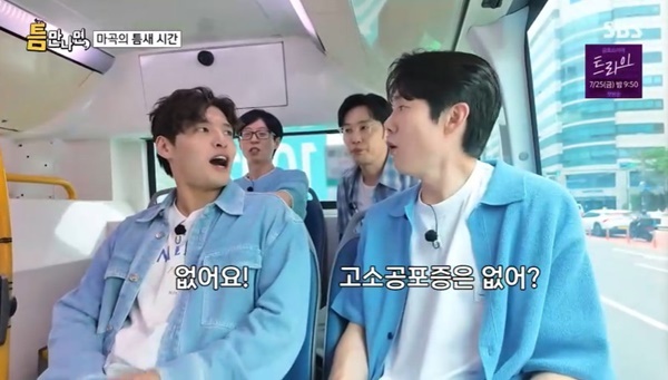 SBS‘틈만나면’캡처SBS‘틈만나면’캡처[뉴스엔유경상기자]강하늘이폐소공포증이있는반면고소공포증은전혀없어번지점프를즐긴다고말했다.7월15일방송된SBS‘틈만나면’에서는배우강하늘,서현우와마곡에서만났다.강하늘은버스를타고이동하며“우울할때찾아보는영상이있다”고유재석의‘무한도전’싸브레영상을언급했다.외국인이스테파니라고제이름을밝히자유재석이잘못듣고“싸브레?”라고말한다음모르는사람들에게“연인이냐”고물어버스분위기를망치고줄행랑을치는영상.유재석은“내가시민인터뷰엉망진창된게많다”고인정했고,강하늘은“같이버스를타게되다니”라며유재석과같은버스를탄데감격했다.이어강하늘은“폐소공포증이심해서만원버스를못탄다.지하철을많이타긴한다.지하철도만원이면다음역에가서내렸다가쉬었다가다음차를타고좀더가고그런다”고말했다.유연석이“공연할때그런느낌이없었냐.객석꽉차고그러면”이라고묻자강하늘은“그건상관없다.폐소공포증이라막혀있는게문제다.심해져서렉카차촬영도힘들다.차를올려서찍으면문이안열린다.컷할때마다창문내리고밖에나왔다가다시들어가서촬영을한다”고답했다.유연석이“고소공포증은없냐”고묻자강하늘은“아예없다.우리나라유명한번지점프다하러다녔다”고대답했다.강하늘은번지점프는트여있어서오히려편하다고했고유재석이부러움을드러냈다.(사진=SBS‘틈만나면’캡처)뉴스엔유경상yooks@기사제보및보도자료[email protected]ⓒ뉴스엔.무단전재&재배포금지Copyright©뉴스엔.무단전재및재배포금지.