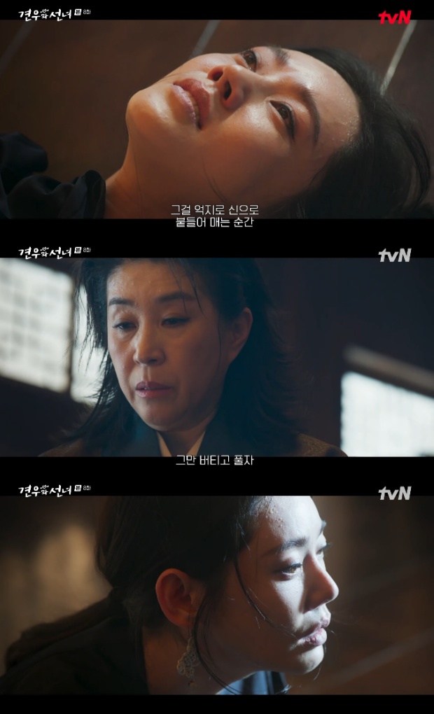 추자현김미경[티브이데일리한서율기자]'견우와선녀'에서추영우와추자현이갈등했다.14일방송된tvN월화드라마'견우와선녀'7회에서는악귀봉수(추영우)로부터배견우(추영우)를지키려는박성아(조이현)의모습이그려졌다.이날악한마음을품게된염화(추자현)의과거일화가밝혀졌다.그는아이를잃은슬픔에아기귀신을다시만나고자기도를올렸고잘못된선택으로신력이약해졌다.몸주신까지잃은염화는악신이된아기귀신을잡고있었고이를발견한신어머니가살풀이를진행했다.신어머니는"억지로신으로붙들어매는순간연이묶여악귀가된다.천도가안된다.영원히구천을떠돈다.너하나안외롭자고네자식에게할짓이냐"라고일갈했다.하지만염화는"내가방법을찾을수있었다.내가내새끼무슨방법을쓰더라도지킬수있었다"라며울분을토했다.신어머니는"나도너를못지켜서쩔쩔매는데네가어떻게지켰겠냐"라며반박했지만염화는"나한테살풀이해준거땅을치고후회할거다"라고저주했다.그는신어머니에대한원망도토해냈다.그는"같잖은엄마노릇을하겠다는거냐.당신나한테아무것도아니다.나버렸잖지않냐.포기했으면서뭘다시주워서정성을들이냐.나대신할대타는애초에구하지않았냐.얘는언제버릴거냐"라며분개했다.차강윤조이현추영우염화는악귀봉수를자신의신으로받기원했으나봉수는배견우의몸에서벗어나지않으려고했다.이에박성아는그의옆에붙어다니며봉수가날뛰지않도록자제시켰다.두사람은손을잡고함께잠에드는건물론학교생활중에도손을잡고다녔다.두사람은가까워진거리만큼달달한로맨스의시작을전했다.배견우는박성아에게"좋아한다"라고말했고박성아는"난처음부터좋아했다.거꾸로법당들어온그날바로반해버렸다"라며애정을드러냈다.두사람의다정한모습에표지호(차강윤)는본인의마음을확인하고질투를느꼈다.그는"둘이손잡고다니는거좀그렇다"라며박성아대신본인이인간부적이되겠다고나섰고결국박성아에게진심을고백했다.표지호는"너한테꼭해야할말이있다.나너좋아한다.언제부터인지는모르지만견우옆에있는네모습을보고내마음을알게됐다.견우와친해지는것도인간부적이된것도너때문이다.네첫사랑인데그가죽으면네가너무슬퍼할것같았다"라고고백했다.하지만세사람의첫사랑은악귀봉수를쫓고난이후본격적으로시작하기로했다.표지호는"아직은차지마라.나배견우운명이랑싸우느라제대로겨뤄본적없다"라고부탁했고박성아는"각자첫사랑은보류하자.봉수떼고그때다시얘기하자"라며그의요구를받아들였다.추자현추영우하지만악귀봉수는배견우의몸에서나갈생각이없었다.두사람은귀를공유하게됐고이사실을알게된왕어머니는"이목구비순으로귀신에게잡아먹힌다.혹시라도몸에변화가생기면바로말해라"라고경고했다.봉수의위험성을자각한배견우는그를다룰수있는방법을찾았다.더불어봉수의트라우마였던총소리를이용해더이상사람을해치지않겠다는약속도받아냈다.배견우는"내가봉수다루는법을알게됐다.앞으로성아가위험해질것같으면바로말씀해드리겠다"라며박성아를지키겠다고다짐했다.이상황을지켜보던염화는못마땅한마음을드러냈다.그는봉수에게"슬슬정신차려라.계속걔몸에머무르다소멸한다"라며으름장을놓았다.이에봉수는"내가소멸하면넌방법있냐.너나못받으면더이상무당짓거리못한다.너랑나주술계약으로묶인거모르냐.나잘보살피고어여쁘게봐달라"라며받아쳤다.염화는봉수의고집에또다른방법을생각했다.그는봉수와배견우를고통으로밀어넣으며한몸으로만드는주술을행했고"지를못벗어날줄을알고그걸역으로이용하냐"라며사악한마음을드러냈다.결국배견우는영안까지트였고귀신과가까워지는자신에불안감을느꼈다.조이현추영우[티브이데일리한서율기자[email protected]/사진=tvN'견우와선녀']조이현|추영우|추자현[Copyrightⓒ*세계속에新한류를*연예전문온라인미디어티브이데일리(www.tvdaily.co.kr)/무단전재및재배포금지]Copyright©티브이데일리.무단전재및재배포금지.