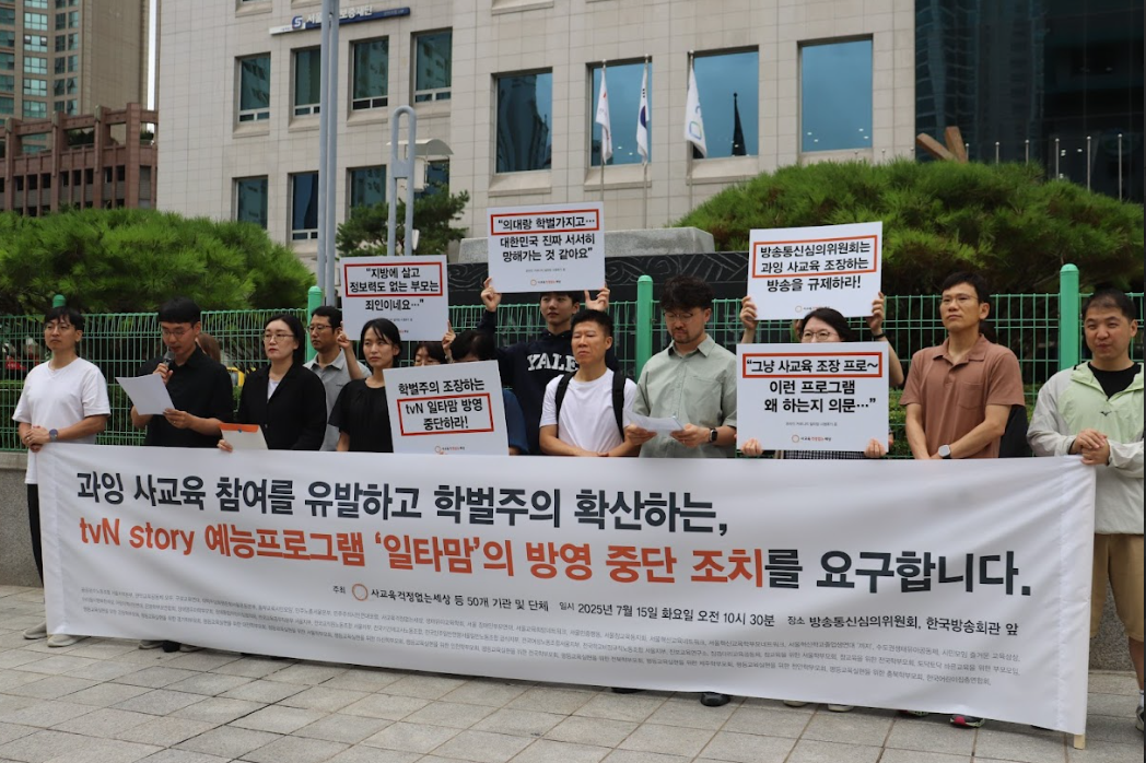사교육걱정없는세상등,전국51개기관및단체연대모임제공명문대입학비결을전하는예능프로그램‘일타맘’에대해시민단체들이학벌주의와사교육을조장한다며방송중단을요구했다.‘사교육걱정없는세상’(사걱세)등51개시민·사회단체는15일방송통신심의위원회(방심위)와한국방송회관앞에서기자회견을열고“방심위는‘일타맘’에시정권고및방송중단등의조치로악영향이확산하지않도록해야한다”고주장했다.시민단체들은“이방송은사교육경감취지를담은발언이일부포함되어있지만,조기사교육,발달에맞지않는과잉학습,학벌주의를조장하고있다”며“방송의목적과실제내용이다른이율배반적요소를다수포함하고있다”고비판했다.또“일타맘에대한방송통신심의위원회의모니터링,심의를요구한다”며“방심위는시정권고및방송중단등해당방송의악영향이확산되지않도록조속한조치에나서야한다”고주장했다.종합엔터테인먼트채널인tvN(tvNstory)은지난달26일예능프로그램인일타맘의방영을시작했다.이프로그램은‘명문대학’에자녀를합격시킨학부모들이출연해게스트(학부모)에자녀교육에대한조언및정보를제공하는내용으로구성되어있다.tvN은“혼란스러운정보속에서엄마들의길라잡이가되어드리기위함”이라고기획취지를밝히고있다.하지만시민단체들은“방송모니터링결과,해당방송에서다수의방송심의규정위반의심사항이확인됐다”며방송심의규정제28조위반(사치스러운사교육소비를조장해사회건전성을위협하고있음),제21조③항위반(부모재력,출신지역,학력에따른차별을조장),제43조②항위반(아동과청소년의건강한발달을위협)등에해당한다고지적해왔다.51개시민·사회단체연대모임제공이들은“2024년대한민국초중고사교육비총액은29조2천억원으로이미역대최고액이었던2023년사교육비기록을훌쩍뛰어넘었다.이는영유아사교육과재수시장을포함하지않은수치에불과하며,실제사교육비총액은30조원이상이었을것으로보인다”며“방송·연예인등셀럽(celebrity)을앞세워고액사교육상품을명품처럼포장하고,트렌드를홍보하는콘텐츠가공중파및지상파는물론유튜브콘텐츠에이르기까지다양한채널을통해확산되고있다.이같은콘텐츠들은대체로오락·예능프로그램을표방하고있지만,과잉사교육을유발하고,학생과학부모의고통을교육열로미화해선전하는식으로사회의건강한상식을훼손하고있다”고지작했다.단체들은“tvN이지난6월26일부터방영을시작한‘일타맘’을모니터링했다.일타맘은종합엔테인먼트채널인tvN(tvNstory)에서2025년6월26일방영을시작한프로그램으로,소위‘명문대학’에자녀를합격시킨학부모및사교육업계의컨설팅전문가를패널로구성해자녀교육에대해고민하는학부모출연자에게해법을전수하도록하는예능프로그램”이라며“방송을‘모니터링’한결과다수의‘방송심의에관한규정’위반소지가발견되어본기자회견을통해그내용을공개하고,담당기관에심의를요청하고자한다.방심위는오늘회견문에담긴내용과심의요청서를참조하여조속히‘일타맘’에대한조치를내려주시길바린디”고촉구했다.다음은51개시민·사회단체공식요구전문■우리의요구일타맘이계속방영되어학부모의불안과위화감을조장하고,사교육참여를부추기는것을저지하기위해우리연대단체들은정부와tvN측에강력히요구합니다.방송통신심의위원회는방송심의를통해본단체들이제기한<일타맘>의문제점을심의검토하여,방송이학생과학부모들의과중한사교육(비)부담을덜어내는일에이바지할수있도록시정요구및폐지를신속히결정해주시기바랍니다.그간많은공중·지상파방송국들이시청률확보에만급급한나머지사교육관련컨텐츠들을아무런문제의식없이공개했으며,시민사회의반복된규탄이이어졌습니다.그럼에도정부의단호한대응이부재했던탓에관련컨텐츠들이각종미디어를통해확산되고있습니다.tvN의일타맘외에도현재방영중인‘채널A의티쳐스’시리즈도사교육종사자를교육솔루션전문가로섭외해컨설팅을받는유사프로그램입니다.이런콘텐츠들의공통적문제점은학생들이직면한학습문제의해결을위해서는,‘사교육전문가들의도움이필수’라는인식을심어준다는것입니다.특히예능프로그램으로제작될경우,사교육업자조언을더욱극적으로부각해효과를과장하고,그들은대중적스타로인식하게할수있습니다.결국학부모들의사교육비부담은높아지고,학생들의의존도는더욱높아질것입니다.방심위는이번일타맘심의를통해계층간위화감과학벌주의를조장하고,사교육의존도를높이는무책임한콘텐츠의확산을막을수있는방송제작가이드라인을확립해주시길바랍니다.한편tvN과제작진은방송내용의유해성과사회적파장을인정하고,시청자와국민앞에공식사과하고,재발방지대책을마련하길바랍니다.대중의사랑을받는대형채널인tvN은사교육과열과교육불평등문제를심층적으로다루고,공교육강화및교육다양성확대에기여하는공익적콘텐츠제작을선도해야할것입니다.모두에게유익한공익적교육프로그램을만들고자한다면,무엇보다도현실속다수의학생·학부모들이겪는고통에공감해야할것입니다.극소수계층,혹은적자생존의