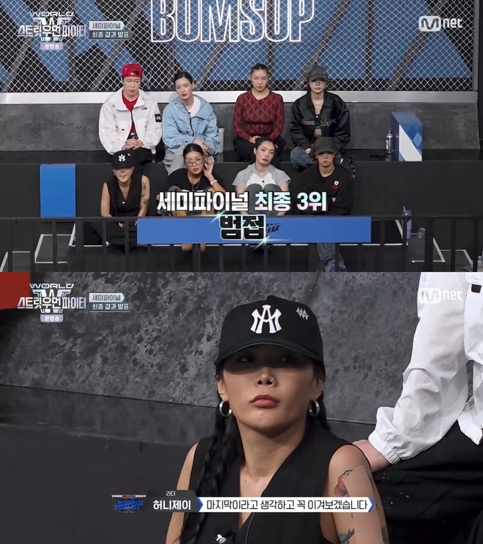 사진=Mnet[스포츠투데이김태형기자]범접(BUMSUP)이파이널문턱을넘지못하고아쉽게탈락했다.15일방송된Mnet'월드오브스트릿우먼파이터'에는세미파이널'댄스필름'미션결과발표와함께파이널로향하는세크루가정해지는모습이그려졌다.이날'댄스필름'미션의메인구간은글로벌대중평가로결정,유튜브에올라온영상의조회수,좋아요수를합산해서순위를매겼다.그결과1위는오사카오죠갱(OSAKAOjoGang)이차지하며메인구간의주인공이됐다.2위는범접(BUMSUP),3위는에이지스쿼드(AGSQUAD),4위는모티브(MOTIV)였다.또한저지들이평가한결과베스트댄스크루는에이지스쿼드(AGSQUAD)로결정돼가산점100점을획득했다.이로써세미파이널최종1위는에이지스쿼드(AGSQUAD)가차지했다.앞서'글로벌아티스트퍼포먼스'미션에서사위티의선택을받아가산점100점을받았고,베스트댄스크루에서가산점100점을받으며가장먼저파이널에진출했다.오사카오죠갱(OSAKAOjoGang)역시최종2위로파이널에진출했다.반면범접(BUMSUP)은총800점으로최종3위,모티브(MOTIV)는최종4위에올라탈락배틀로향했다.5라운드까지이어진치열한탈락배틀결과,범접(BUMSUP)은모티브(MOTIV)에패해최종탈락했다.멤버들은아쉬움의눈물을흘렸다.허니제이는"저희가4년전에처음'스우파'를통해서많은사랑도받고이인연을만날수있었다.그여정속에서큰힘이된멤버들을만난것만으로도행복하고멤버들도그럴거라고생각한다.앞으로도저희는안주하지않고열심히춤출테니까많이응원해주시고예쁘게봐달라"며눈물의소감을전했다.[스포츠투데이김태형기자[email protected]]Copyright©스포츠투데이.무단전재및재배포금지.