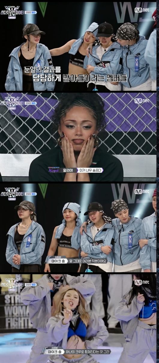 [OSEN=임혜영기자]범접이파이널에진출하지못하고탈락했다.15일방송된Mnet‘월드오브스트릿우먼파이터’(이하‘월드오브스우파’)8회에서는댄스필름미션결과발표와함께파이널로향할세크루가정해지는모습이그려졌다.미션에서하위점수를받은범접과모티브는탈락배틀을진행했다.파이널진출을앞두고벌이는탈락배틀인만큼,수준높고아이디어넘치는안무들이쏟아지자저지들도심사하는데에고충을드러냈다.총5번의배틀을펼치며3:2로승리를거머쥐게된모티브.탈락하게된범접은덤덤한척했지만이내서로를꼭껴안고눈물을흘렸다.립제이는“후련하다”라고말했고,허니제이는프로그램에끝까지함께하지못한것에아쉬움을드러냈다.이를지켜보던모티브는물론,타크루들또한범접의탈락에충격을표했다.에이지스쿼드의알리야는“이거너무슬프다”라고말했고,오사카오죠갱의미나미도눈물을훔쳤다.저지마이크송은“가장중요한것은여러분이한국에기반을만든것이다.시즌1이글로벌크루들을데려와서‘월드오브스우파’가된것은미친것이다.그게실현된건말그대로여러분덕분이다.시즌1이망했으면아무것도없었다.여러분들이돌아와서기반을다졌다는사실뿐만아니라다시한다는것.리스크를감수하고그케미를찾기란쉽지않다”라고격려의말을건넸다.박진영또한“이번에여러분이만든작품은영원히사람들마음속에남아있을것이다.최고의작품이었다.자랑스럽다”라고다독였다.저지와의인사를마친범접멤버들은타크루멤버들과도껴안으며마지막인사를나누었다.‘월드오브스우파’초반,아이키를‘틱톡커’라고무시하듯말했던알리야도어느덧아이키의팬이된듯"우리틱톡같이해야하는거알지?”라며살갑게인사를건넸다/[email protected][사진]Mnet‘월드오브스트릿우먼파이터’Copyright©OSEN.무단전재및재배포금지.