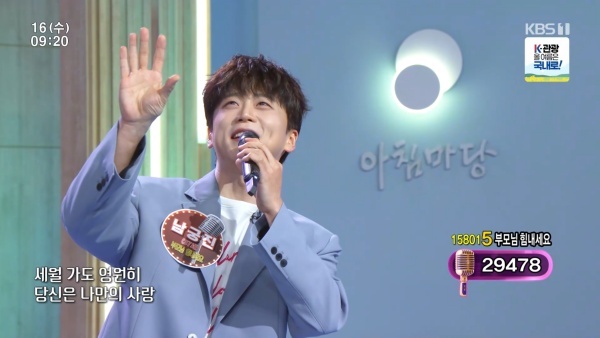 아침마당/사진=KBS1캡처[스포츠투데이정예원기자]'아침마당'남궁진씨가3승을거뒀다.16일방송된KBS1'아침마당'은'도전꿈의무대'로구성됐다.아침마당/사진=KBS1캡처이날가장먼저무대에오른이는강석씨였다.강씨는"어릴때부터트로트신동으로불렸고,지금까지트로트가수의길을걷고있다"면서도"함께활동했던정동원,성민지,남승민등저만빼고모든이들이유명해졌지만전아직무명가수다.저도제이름을알리고싶다"고다짐했다.다음으로'아버지께바칩니다'김지훈씨가모습을드러냈다.김씨는"아버지가주식투자로한순간에모든걸날리셨다.세월이흐르니아버지가이해가되더라"는사연을전하며눈물을보였다.세번째로무대에오른'쌍둥이가수'는최대윤,최대진씨였다.최대진씨는"아내는제가음악을완전히관둔것으로알지만,옷가게를운영하며노래도계속하고싶다"는의지를내비쳤다.두사람은최진희의'천상재회'를선곡,짙은보이스로절절한감성을표현해냈다.무대를마친후최대윤씨는아내에게"아이셋키우느라고생많았다.사랑한다"고마음을전했다.마지막주자는'할머니감사합니다'김신기씨였다.어린시절할머니의손에자란김씨는돌아가신할머니에대한그리움을표하며진성의'보릿고개'를열창했다.아침마당/사진=KBS1캡처투표가진행되는동안김용임이축하공연으로신곡'역대급여자'를불렀다.이내투표결과가공개됐고,우승자는김신기씨였다.김씨는놀란표정이었다가이내활짝웃어보이며우승의기쁨을만끽했다.마지막으로4승에도전하는'부모님힘내세요'남궁진씨가등장했다.남궁씨는임영웅의'사랑해요그대를'을열창하며연승성공자의저력을과시했다.김신기씨와남궁진씨중승리한사람은남궁씨였다.4승에성공한그는"처음에나올땐많이떨렸는데이런기회를얻어서기쁘다.초심잃지않고최선다하겠다"며"항상응원해주시는어머니,아버지께감사드린다"고소감을밝혔다.[스포츠투데이정예원기자[email protected]]Copyright©스포츠투데이.무단전재및재배포금지.