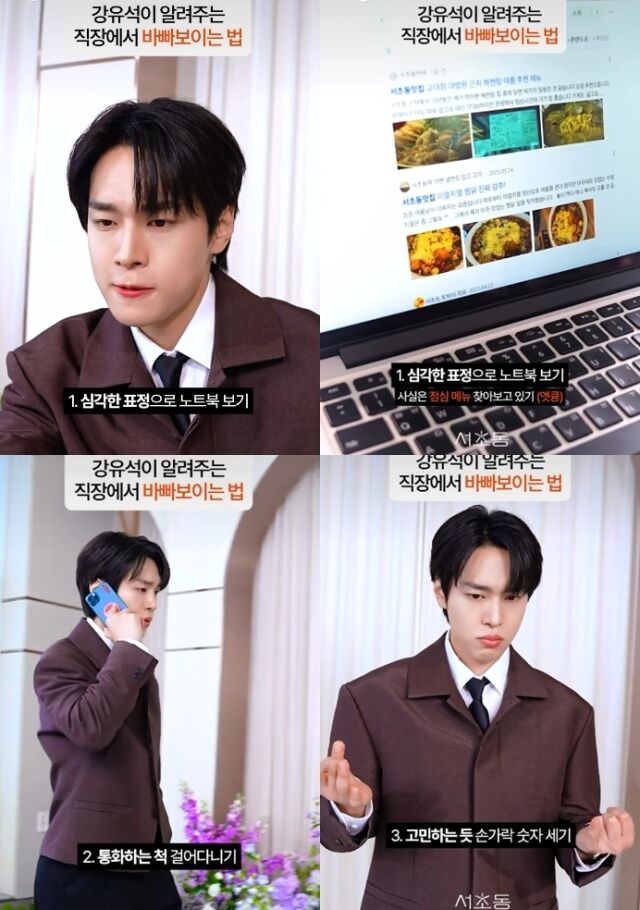 강유석소셜미디어[마이데일리=임현주기자]배우강유석이재치넘치는연기로직장인들의공감대를불러일으켰다.강유석은16일소셜미디어스토리에"강유석이알려주는직장에서바빠보이는법"이라는유쾌한주제를담은영상을업로드했다.공개된영상속강유석은슈트차림으로진지한표정을지으며'직장인생존꿀팁'세가지비법을소개했다.첫번째팁은바로“심각한표정으로노트북보기”다.하지만화면에는점심메뉴를검색중인모습이담겨있어폭소를자아냈다.강유석은“사실은점심메뉴찾고있기”라는자막과함께여전히표정은심각하게유지했다.강유석소셜미디어두번째팁은“통화하는척걸어다니기”.이어폰도없이휴대폰을귀에댄채진지한얼굴로사무실을돌아다니는모습은마치회의중인듯한착각을불러일으켰다.마지막세번째는“고민하는듯손가락숫자세기”.사무실에서심각한표정을지으며손가락으로뭔가계산하는연기는보고만있어도‘업무몰입중’이라는착각을들게했다.세가지모두직장인들이라면모두가공감할수있는내용이어서강유석의연기에빠져들며보게된다.한편,강유석은tvN토일드라마'서초동'에출연중이다.'서초동'은매일서초동법조타운으로출근하는어쏘변호사5인방의희로애락과성장을그린드라마다.강유석은극중최강외향인수다쟁이변호사조창원역을맡아유쾌한매력을선보이고있다.Copyright©마이데일리.무단전재및재배포금지.