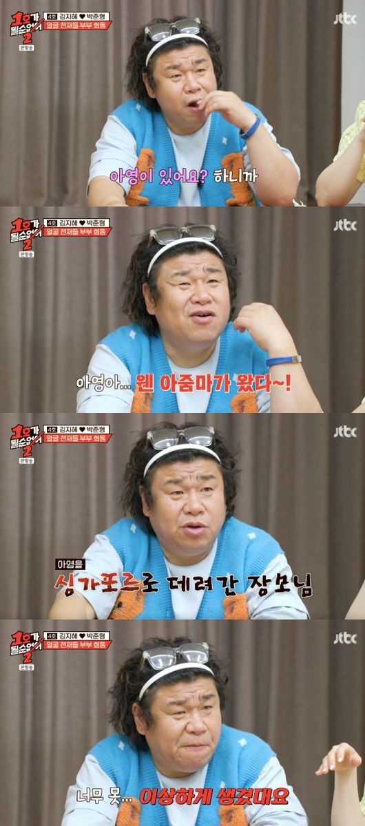 [OSEN=임혜영기자]오정태와아내와헤어질뻔한사연을털어놨다.16일방송된JTBC‘1호가될순없어2’에서는김지혜,박준형부부의일상이공개되었다.김지혜,박준형은집으로오정태부부,오지헌부부를초대했다.식사를시작한이들.오정태는“준형이형이의외로다정하지않는데나한테는사랑스러운눈빛으로쳐다본다”라고말했고,김지혜는박준형이다정하다는것은그만큼못생긴사람이라고말해웃음을자아냈다.오정태는“처음아내의집에갔을때아내아버지가인터폰으로보시고‘아영아웬아줌마가왔다’하시더라.아무말없으시다가어머님이아내를데리고싱가포르로가버리신것이다.결혼안시키려고.너무이상하게생겼다는것이다”라고말했다.오정태의아내는“(결혼하기엔)너무안좋은게많은것이다.나이도많고인상도화난것같고.그때당시남편이완전무명이라수입도없었다.엄마한테용돈받은걸로줬다”라고말했다.이어“누구든오정태한테안빠질수없을것이다.오빠는남성미가있다”라고오정태를두둔했다.박준형은“정태가아내얘기할때나한테자랑한게있다.‘우리아내는요,나한테서땅콩냄새가난다더라’했다”라고말문을열었고,오정태의아내는“코옆에서감자냄새가난다.연애때계속맡았다”라고직접오정태의얼굴냄새를맡아모두를경악하게만들었다./[email protected][사진]JTBC‘1호가될순없어2’Copyright©OSEN.무단전재및재배포금지.