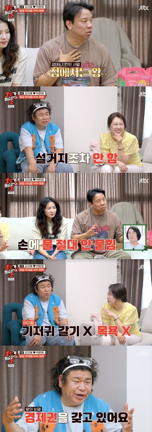 [OSEN=임혜영기자]박준형이오정태,오지헌의허세에기가죽은모습을보였다.16일방송된JTBC‘1호가될순없어2’에서는김지혜,박준형부부의일상이공개되었다.박준형,김지혜부부의집에‘얼굴천재부부’들이출동했다.오지헌-박상미부부,오정태-백아영부부가찾아온것.오지헌은“의외로정태형과나는집에서왕이다.설거지해본적이없다”라고말했고오정태는“설거지같은건아예안한다”라고덧붙였다.오정태의아내는오정태가육아에서는구경꾼이라며기저귀갈기,목욕하기등을한번도해본적이없다고밝혔다.오정태,오지헌은서열정리방법에대해“경제권을항상갖고있다.아내가생활비를받아쓴다”라고설명했다.이에박준형은부러움이가득한눈빛을지울수없었다.박준형은육아와집안일을적극적으로하기때문.오정태는“옛날엔준형이형이행사의왕이다.어느순간부터안하더라.집에서행사를(하고있었구나)”라며박준형의애교를측은하게말했다./[email protected][사진]JTBC‘1호가될순없어2’Copyright©OSEN.무단전재및재배포금지.