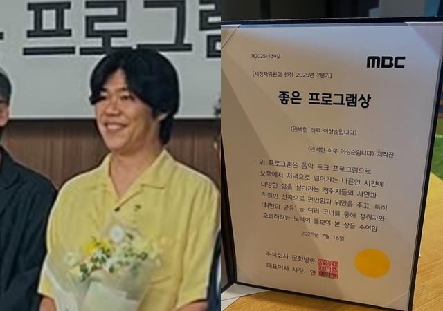 MBCFM4U‘완벽한하루이상순입니다’공식소셜미디어[뉴스엔박수인기자]이상순이진행하는라디오프로그램'완벽한하루'가'좋은프로그램상'을수상했다.MBCFM4U'완벽한하루이상순입니다'제작진은7월16일공식소셜미디어를통해수상소식을알렸다.제작진은"MBC시청자위원회가뽑은좋은프로그램상'완벽한하루'가수상하게되었습니다.완벽한하루청취자분들께시상식현장공유합니다"라며시상식현장사진과상장을공개했다.공개된상장에는'위프로그램은음악토크프로그램으로오후에서저녁으로넘어가는나른한시간에다양한삶을살아가는청취자들의사연과적절한선곡으로편안함과위안을주고특히'취향의공유'등여러코너를통해청취자와호흡하려는노력이돋보여본상을수여함'이라는문구가적혀있다.한편이상순은지난해11월'완벽한하루이상순입니다'DJ를맡았다.방송은매일오후4시부터6시까지진행된다.뉴스엔박수인abc159@기사제보및보도자료[email protected]ⓒ뉴스엔.무단전재&재배포금지Copyright©뉴스엔.무단전재및재배포금지.