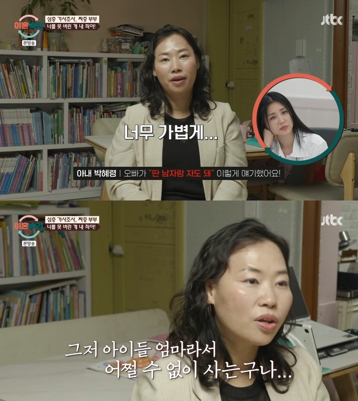 ‘이혼숙려캠프’.사진IJTBC‘이혼숙려캠프’방송캡처‘이혼숙려캠프’짜증부부남편이아내에게입에담지못할막말을했다.17일방송된JTBC‘이혼숙려캠프’에서는짜증부부의가사조사가그려졌다.이날짜증부부는싸울때마다이혼이야기를입에담았다.실제로짜증부부는법원에이혼서류를접수해놓은상태로녹화기준이혼숙려기간을지내고있다고.아내는“남편이너무가볍게‘다른남자랑자도된다’라고이야기했다.남편이나를여자로안보는구나싶었다.아이들엄마라서어쩔수없이사는구나싶었다”고털어놨다.이를본서장훈이“이혼이야기하면서다른남자랑자도된다는이야기는왜하는거냐”고묻자남편은“아내의습관이다.내가반응해주지않으면아내가‘안안아주면다른남자랑잔다’라고한다.나를공격하는수단으로쓴다.자주쓴다”고변명했다.그러나아내는“남편이이혼이야기를하니까말한거다”라고반박했다.한편‘이혼숙려캠프’는매주목요일오후10시10분방송된다.[이세빈스타투데이객원기자]Copyright©스타투데이.무단전재,재배포및AI학습이용금지
