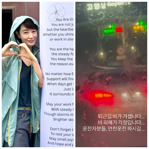 김혜수가따뜻한미소뒤숨겨진촬영장의현실을전했다.팬커피차앞에서행복한포즈를남긴후,폭우쏟아지는귀가길에서걱정어린메시지를건넸다.김혜수는18일자신의SNS에태국팬들이보내준커피차인증샷과함께퇴근길근황을전했다.이날김혜수는tvN‘시그널2’촬영을마치고고양시에서귀가중이었다.그는“퇴근길비가거셉니다.비피해가걱정입니다.운전자분들,안전운전하시길”이라고전하며팬들과소통했다.공개된사진속김혜수는태국팬들의선물앞에서편안한미소를보였다.연두색우비를걸친채하트포즈로밝은에너지를전했다.커피차문구에는“HappinessSignaltoHyeSoo”라는따뜻한문구가새겨졌고,옆에는응원의시가담긴보드도세워져눈길을끌었다.라벤더톤컬러로통일된커피차와포토존앞에서김혜수는자연스럽고도고급스러운존재감을드러냈다.하지만같은날저녁에는폭우로앞이보이지않는귀가길상황을영상으로공유하며분위기를반전시켰다.그는“작은배려가소중해지는날씨다.모두무사히귀가하길바란다”고덧붙이며촬영장에너지와퇴근길현실을오가는일상을진솔하게전했다.사진=김혜수SNS한편김혜수는9년만에‘시그널2’로복귀한다.‘시그널2’는오는2026년상반기방송예정이다.[김승혜MK스포츠기자][ⓒMK스포츠,무단전재및재배포금지]Copyright©MK스포츠.무단전재및재배포금지.