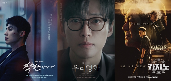 JTBC금요시리즈'착한사나이'VSSBS금토드라마'우리영화'VSMBC특선시리즈'카지노'아이즈ize이경호기자JTBC금요시리즈'착한사나이',SBS금토드라마'우리영화',MBC특선시리즈'카지노'./사진=JBC,SBS,MBC18일금요일밤,안방극장시청자들의채널선택이어디로향할지관심이쏠리고있다.18일오후10시안방극장에서드라마시청률한판전쟁이펼쳐진다.이날이동욱주연의JTBC금요시리즈'착한사나이'(연출송해성박홍수,극본김운경김효석)가첫방송된다.오후8시50분1회에이어오후10시2회가방송된다.'착한사나이'는건달집안의장손이자의외의순정을품은박석철과가수를꿈꾸는그의첫사랑강미영이펼치는감성누아르다.이동욱이박석철역을이성경이강미영역을각각맡았다.'착한사나이'가금요일밤2회연속방송되면서MBC금토드라마,SBS금토드라마와도시청률경쟁을펼치게됐다.경쟁시간은오후10시대.작품세개가맞붙는셈.JTBC금요시리즈'착한사나이'./사진=JTBC이런가운데,'착한사나이'가시청자들을사로잡을수있을지관심이쏠리고있다.이동욱표누아르가현재방송중인SBS금토드라마'우리영화',MBC금토드라마'카지노'(시즌1)를제치고새롭게금요일드라마시청률1위까지달성할수있을지귀추가주목되고있다.여기에이동욱이'착한사나이'를통해올상반기구겨졌던자존심도회복할수있을지이목이쏠리고있다.이동욱은지난3월방송된'이혼보험'에주인공으로출연했다.'이혼보험'은이동욱외에이주빈,이광수,이다희등이주연을맡았다.'이혼보험'은올상반기편성된tvN월화극중최하위시청률(닐슨코리아유료플랫폼전국기준.이하동일기준)을기록했다.첫방송시청률3.2%가자체최고시청률이었으며,이후시청률이하락세에빠지면서11회에는자체최저시청률0.9%를기록한바있다.'시청자들과이혼'이라고해도과언이아닐정도로이동욱은쓴맛을봤다.이동욱은이번'착한사나이'로분위기확달라진모습으로시청자들과재회한다.감성누아르로'이혼보험'에서보여주지못했던특유의몰입도높은감성연기가예고되어있다.이동욱의'착한사나이'등장이금요일안방극장에불러일으킬변화가기대되고있다.기존MBC,SBS금토드라마와경쟁에서승리가능성도없지않다.MBC,SBS의금토드라마시청률이현재10%를넘지못하고있기때문이다.SBS금토드라마'우리영화'./사진=SBS지난6월28일MBC금토드라마'노무사노무진'종영후,SBS금토드라마'우리영화'(연출이정흠,극본한가은강경민/의시청률반등이기대됐다.그러나'우리영화'는'노무사노무진'후속으로TV로방송을시작한MBC특선시리즈'카지노'(시즌1)에도시청률(닐슨코리아전국기준.이하동일기준)밀린상황.'우리영화'는지난12일10회시청률이3.9%를기록했다.동시간대방송된최민식주연의'카지노'4회는4.2%로집계됐다.'카지노'가OTT플랫폼디즈니플러스를통해2023년공개된바있지만,4%대까지시청률이오르며'우리영화'의반등을무마시키고있다.'카지노'는특선시리즈로금,토요일오후10시방송중이다.'우리영화'는1회4.2%,3회4.0%의시청률기록후3%대시청률에머물러있다.불행중다행이라고해야할까,3%대를지키며9회,10회에서시청률소폭상승을이뤘다.그러나남궁민주연으로방송전기대를모았던상황에서시청률3%대정체는아쉬움으로남는다.이런가운데,종영까지단2회가남았다.이남은2회에서시청률반등의발판을마련하기위해선,18일오후방송될11회시청률상승이필요하다.전작'귀궁'이시청률10%를돌파했던상황에서,'우리영화'는그야말로시청률부진이기때문.유종의미를거둘발판이될11회가될지이목이집중된다.이동욱주연의'착한사나이'의등판.'카지노','우리영화'에쏠린드라마시청자들이신작으로시청채널을이동하면서새로운강자가탄생할지,'카지노'의상승세가이어질지,종영을앞둔'우리영화'의막판역전이이뤄질지이목이쏠리는금요일오후10시대다./사진=JTBC,SBS,MBCCopyright©ize&ize.co.kr,무단전재및재배포금지