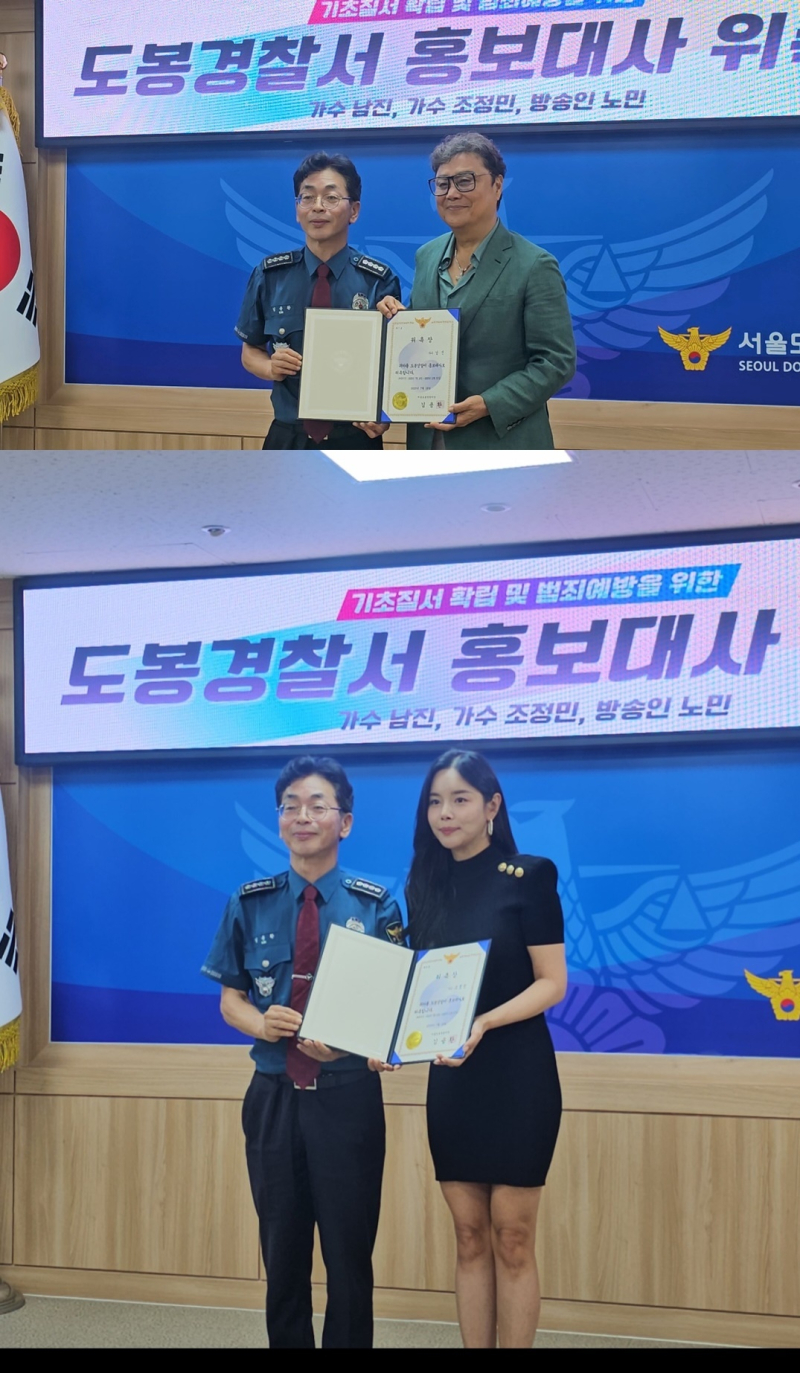 서울도봉경찰서는가수남진과조정민을홍보대사로위촉하는위촉식을18일개최했다.이날행사는서울도봉구도봉경찰서에서열렸으며,경찰서장을비롯한각과장들이참석한가운데성황리에진행됐다.남진과조정민은도봉경찰서홍보대사위촉장을수여받은뒤“나라와국민을위해힘써주시는경찰여러분께진심으로감사드린다”고소감을밝혔다.두사람은앞으로도봉경찰서와함께▲기초질서확립캠페인▲사이버도박근절홍보▲보이스피싱예방활동▲교통안전캠페인등다양한공익활동에참여할계획이다.이들은“경찰의노고를널리알리고,국민과의소통에힘을보태는홍보대사로서책임감을갖고활발히활동하겠다.앞으로도봉구,더나아가대한민국범죄예방에힘을보태겠다”고다짐했다.도봉경찰서는“두가수의대중적영향력을통해주요치안정책및경찰범죄예방활동에대한시민들의관심과참여가확대되기를기대한다”고말했다.김용환도봉경찰서장서장은“앞으로홍보대사와함께시민들이체감할수있는안전한도봉구를만들것”이라고했다.한편남진은올해데뷔60주년을맞아전국투어콘서트진행,신곡발매등여전히강력한활동을이어가고있다.조정민은최근직접작곡한신곡‘가지지못한사랑’을발매하며신곡홍보를위해활발한방송및무대활동을펼치고있다.유지희기자[email protected]©일간스포츠.무단전재및재배포금지.