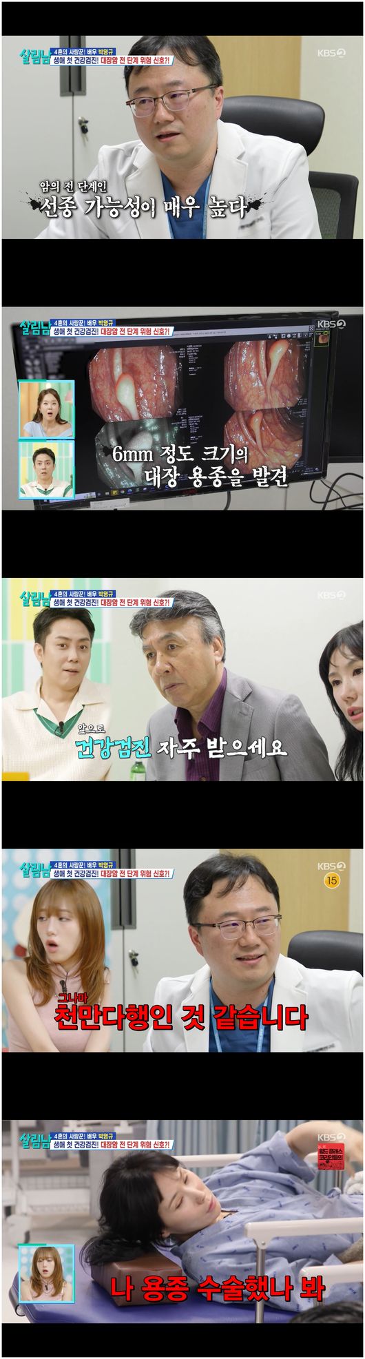 [OSEN=오세진기자]'살림남2'배우박영규가큰결심끝에건강검진에임했다.19일방송된KBS2TV예능'살림남2'에서는배우박영규의건강검진일대기가그려졌다.이날박영규편에는특별한게스트가등장했는데상큼한이미지로솔로가수로서사랑을받는최예나였다.백지영은“가족관계가비슷하던데”라며최예나와박서진에대해물었다.최예나는“저도4살터울의배우최성민이오빠로있다.저도효정씨랑동갑이다”라면서“저는한번씩짜증나서싸운다.출근한사이에오빠가제방침대에서자고있다”라며오빠인배우최성민에대해시시콜콜일러바쳤다.박서진은“저도박효정이제침대를탐해서한쪽침대가푹꺼졌다”라며투덜거렸다.그러나가상의남매가되자두사람은더할나위없이다정한남매처럼굴어,서로의'찐남매'아니면퉁명스럽지않다는것이증명되었다.이날최예나가등장한건박영규의지원사격이나다름없었다.최예나는“드라마‘빌런의나라’에서정말멋있었다.정말멋진배우라고생각한다”라며할아버지와손녀관계로함께박영규와출연했다고밝혔다.VCR초반,분위기는심상치않았다.박영규의아내는자신과박영규가25살나이차이로보이지않는다는댓글이우후죽순달린것에기분이상했기때문이었다.아내는“댓글들이나더러60대로보인다고한다.당신눈에도그렇게보이냐”라며속이상해물었다.박영규는“댓글에그렇게나오냐.말이안되지.그사람들이말한거지”라며시니컬하게답했다.아내는“댓글에채시라닮았다고하는것도자막이민망하대.내가채시라닮았다고말했냐고”라며억울해했다.그발언은백지영이한말이었다.백지영은“내가말한거다.그리고진짜닮으셨다”라며여전히발언철회를하지않겠다고말했다.박영규는“은지원이또래에비해훨씬어려보이는건사실아니냐.연예인이라고다어려보이는건아니다.내가배우라서어린게아니라,근본자체가어려보이는게있어”라며은지원과동갑인25살연하아내를설득하고자했으나오히려독이되었다.이에박영규는“당신은성숙하고,농염한거다.피부과미용이런거내가다해주겠다.마음껏해라.팔자주름부터먼저해라”라며위로아닌위로로아내를뿔나게만들었다.이내밤이깊자두사람은진지한분위기가되었다.박영규가제작진의끈질긴권유로건강검진을받기로한전날밤이었기때문이었다.끙끙앓는박영규는“저기금고있지.뭐가들었는지궁금하지?”라면서“번호하고여러가지서류나등기,다저안에있어”라며아내에게알렸다.해당금고는오로지박영규만열수있는금고였다.아니나다를까,박영규는구사일생을겪었다.의사는“대장내시경하길잘했다.6mm정도용종이있었다.내시경소견상으로는암전단계로보인다.2~3년더방치했으면안좋아졌을거다.암직전인거다”라고말해박영규를놀라게만들었다./[email protected][사진]KBS2TV예능'살림남2'방송화면캡처Copyright©OSEN.무단전재및재배포금지.