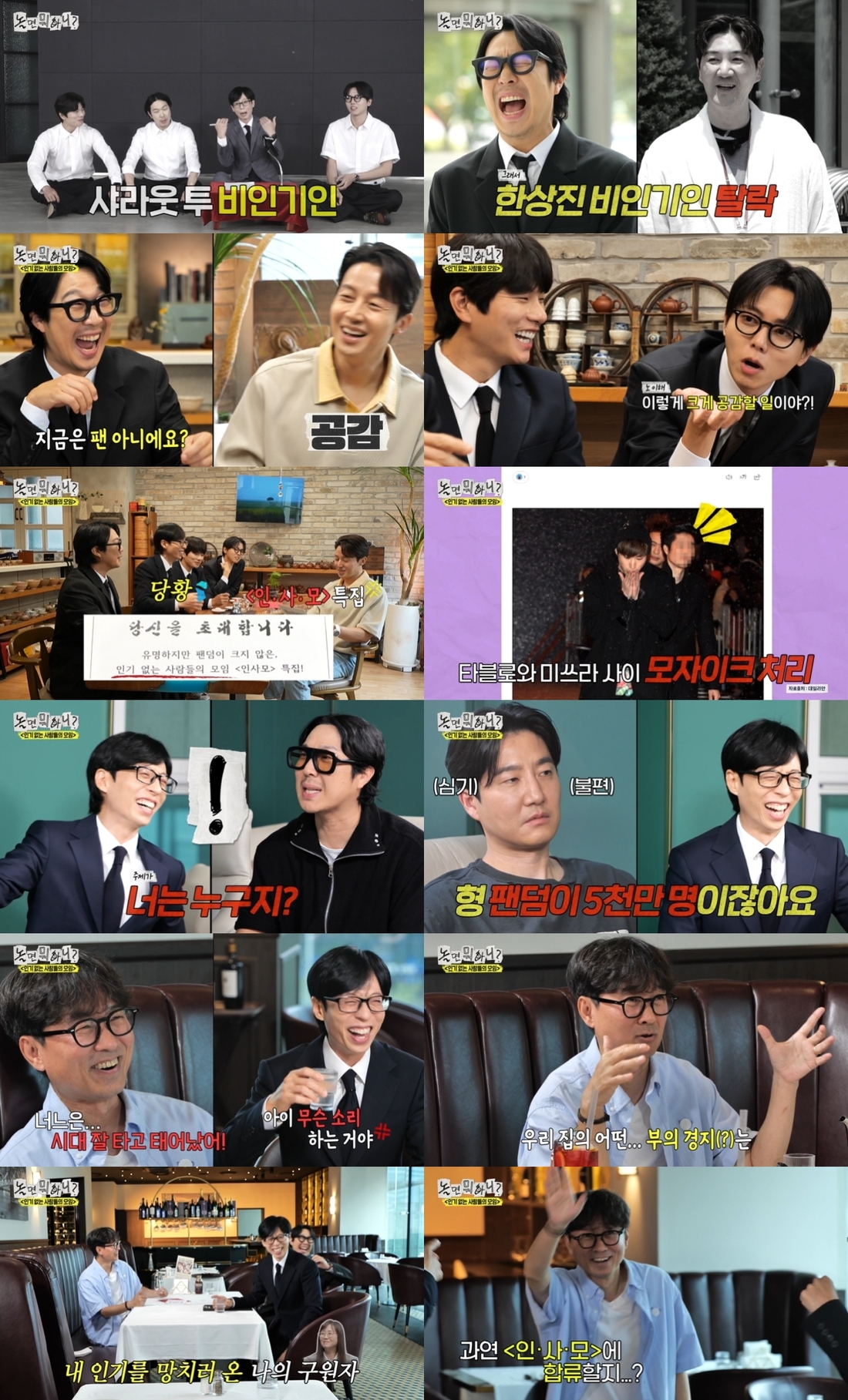 MBC‘놀면뭐하니?’방송화면‘놀면뭐하니?’가인기없는사람들의모임‘인사모’를기획하며,숨어있던팬들의마음에불을지폈다.지난19일방송된MBC‘놀면뭐하니?’는“유명한데인기가없다”고말해왔던하하가자신과같은비인기인들을‘샤라웃(shoutout)’하며구체화된아이템‘인사모(인기없는사람들의모임)’편으로꾸며졌다.이날수도권가구시청률은5.0%를기록하며,전회차보다상승한수치를나타냈다.채널경쟁력과화제성을가늠하는핵심지표2049시청률은2.7%를기록,토요일전체예능1위를차지했다.최고의1분은‘인사모’후보들의면접을마무리하는장면이었다.3명이상의가입희망자가나와‘인사모’가결성될수있을지기대를높이며분당최고시청률이7.2%까지치솟았다.(닐슨코리아수도권기준)유재석,하하,주우재,이이경이처음만난‘인사모’후보는‘유행어제조기’허경환이었다.인기여부를확인하려는멤버들의질문에허경환은“엄마가고정인프로그램에반고정을하고있다”,“팬클럽은회장,부회장이싸워서없어졌다”라고답했다.허경환은“내팬들은숨어있다”고주장했다.이에하하만격한공감을하며웃었고,‘인기서민’이라는말에둘만의공감대를형성했다.유재석은이때다싶어조심스럽게‘인사모’본론을꺼냈고,허경환은발끈했다.유재석은“과거형이었던팬들의마음에불을지펴보자는거다”라고마음을달랬다.초대장을보며망설이는허경환의모습이그의결정을궁금하게했다.두번째후보로힙합그룹에픽하이멤버투컷이등장했다.‘타블로,미쓰라옆에서식탁닦는사람누구죠?’질문이올라올정도로‘에픽하이2인조설’을만든주인공투컷은예능열정을활활불태웠다.투컷은폭행당하는경비원을구하고도그가연예인인줄몰라서뉴스에모자이크처리되고,매니저로오해받은짠내나는에피소드들을풀었다.투컷은비인기인의설움에공감못하는유재석을향해“이게국민MC의실체다.형은팬덤이5천만명(?)이잖아요”라고질투하며,하하와한편이됐다.유재석은에픽하이멤버들에게치이는투컷에게“너그동안너무참았어”라면서‘인사모’초대장에대한회신을기다리겠다고했다.세번째후보는‘스타작가김은희의남편’으로알려진영화감독장항준이었다.장항준은신비감조성을위해마스크를쓴채등장,아내얘기를은근슬쩍자기자랑으로바꿔말하고,유재석의고졸신화를칭찬하며외모도학력도우위를점하는‘관종끼’넘치는모습을자랑했다.‘확신의인사모회원상’에부합하는굴욕담은모두를폭소케했다.김승우-김남주결혼식에서장동건에게아는척을하다가경호원에게제지당하고,자신을알아본사람이김은희작가팬이었다는에피소드가나왔다.3명이상의가입희망자가없을경우‘인사모’는무산이될예정인가운데,과연‘인사모’가실제결성될수있을지관심을집중시켰다.다음방송예고편에는‘80년대가요제’를추진하는유PD와하작가의의기투합이그려져기대를높였다.녹음테이프로심사예정인’80년대가요제’에과연어떤목소리들이참여할지궁금증을끌어올렸다.MBC‘놀면뭐하니?’는매주토요일오후6시30분방송된다.김원희기자[email protected]©스포츠경향.무단전재및재배포금지.