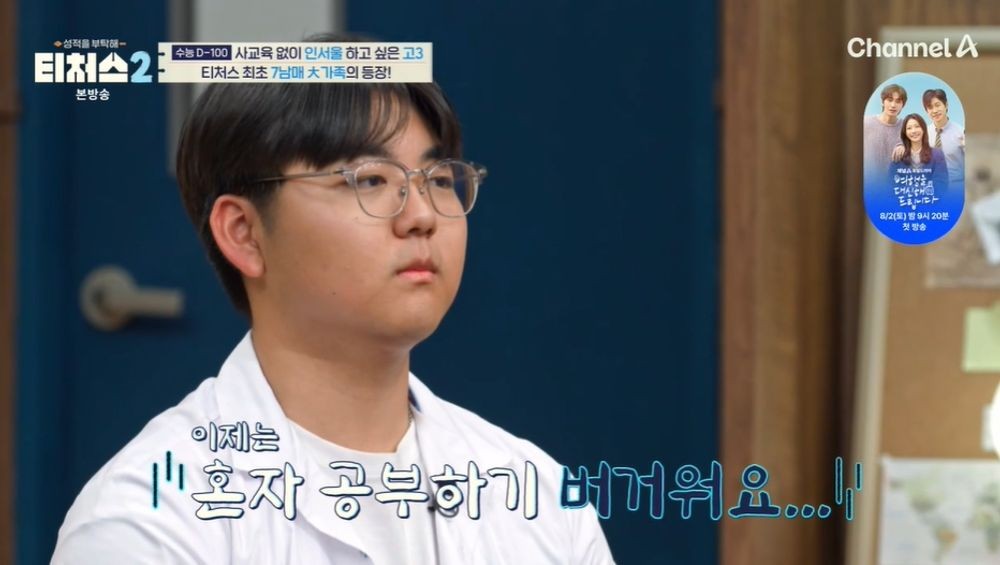 [TV리포트=남금주기자]7남매가족이최초로등장한가운데,도전학생이사교육없이인서울에도전한다고밝혔다.20일방송된채널A'성적을부탁해:티처스2'(이하'티처스2')에는전현무,한혜진,장영란,조정식,미미미누,정승제가출연했다.이날고3백승겸학생이등장했다.정승제는도전학생의등장에"나고3때딱이렇게생겼다.똑같다"라며놀랐고,학생은"친구들이정승제선생님닮았다고한다"라며닮은꼴임을인정했다.도전학생은7남매중다섯째로,'티처스'최초7남매가족의등장이었다.도전학생은"공부만큼은사교육없이공교육으로하자는주의다.형,누나모두혼자공부에대학에입학했고,저도고3까지단한번도학원에다니지않았다.수능이가까워지는데도움을청할때도마땅치않고,혼자공부하려니버겁다"라고털어놓았다.목표는인서울로,독립의로망이있기때문.장영란은도전학생엄마를보며"고3엄마표정같지않은이유가있다.다섯째니까여유가있다"라고이해했고,전현무는"미미미누랑똑같은거다.세대별교육정책을다겪은거아니냐"라고놀랐다.이에엄마는"저도정책이계속바뀌는걸경험했고,이젠말씀해주셔도잘못알아들을것같아서첫째를데리고나왔다"라고설명했다.첫째는"저희7남매중머리는제일좋은데,그에비해서성적은잘안나오는것같다"라고했고,엄마는"큰아이들때는공교육열풍일때라혼자공부해도충분히역량을발휘할수있겠다싶었다"라고밝혔다.셋째누나는전교13등,첫째누나는전교4등을한적있다고.내신이극상위권이었다고.집안분위기는화기애애했다.첫째누나의첫째아이도있었다.전현무는"사람이왜이렇게많냐"라고놀라기도.책상은거실에있었다.도전학생은"사람이많으니까침대만으로도꽉찬다.그래서거실이나주방식탁에서공부한다"라고이유를밝혔다.도전학생은가족들이다있는거실에서공부를시작했다.조카가와서안기면조카를안고공부하기도.조카가리코더를불며놀자선생님들은"시험장에서어지간한소음은신경도안쓰이겠다.집중이되냐"라고신기해했다.조정식은"너무좋은학습법같다.요즘유튜브에수능시험장빌런ASMR도있다.일부러틀어놓고공부하는학생도있다.저도막판실전모의고사에서조교들에게빌런짓을시키기도했다"라고밝혔다.도전학생의성적은5월모의고사에서국영수평균2~3등급수준이었다.정승제는"고난도7문제를제외하고모두맞히는걸목표로삼아야한다.가장불안한단원을풀때바로해설지를보냐"라며"그마음가짐으로3등급벽을못넘는다.넌3등급저주에걸려있는거다"라고진단했다.영어역시전형적인3등급으로,조정식은"시험이어려우면4등급도나올수있겠다싶은3등급"이라고밝혔다.미미미누는현재수준으로선인서울주요대학입학이불가능하다고밝혔고,조정식은"현실적으로사실4등급으로봐야한다"라고전했다.남금주기자[email protected]/사진=채널A'티처스2'Copyright©TV리포트.무단전재및재배포금지