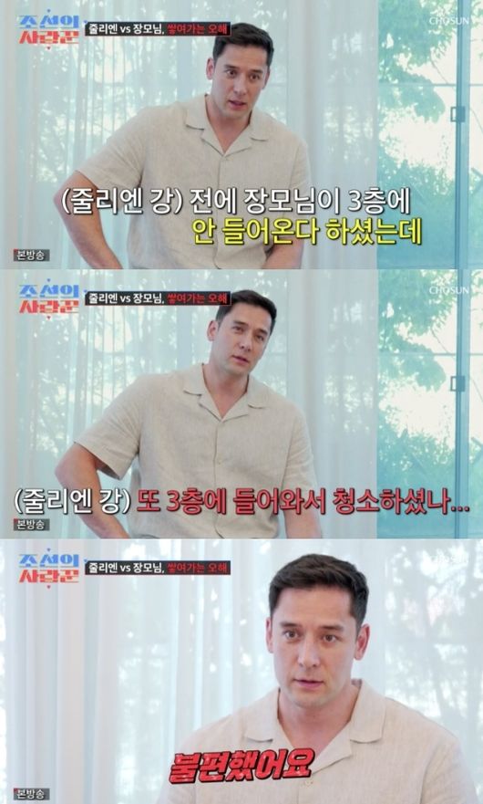 [OSEN=강서정기자]신혼1년차줄리엔강과박지은부부가장서(사위와장모)갈등을예고하며긴장감을자아냈다.지난21일방송된TV조선예능‘조선의사랑꾼’에서는줄리엔강과박지은부부의합가생활이공개됐다.두사람은현재박지은의어머니와함께한집에살고있는상황.줄리엔강은부부의신혼공간과장모의공용공간사이에서불편한속내를드러냈다.이날방송에서줄리엔강은3층의신혼방을소개하며“이곳은나와지은이의가장소중한공간이다.마법이일어나는곳”이라며단단히철벽을쳤다.그러나박지은은“2층은공용공간이다.어머니와함께쓰고있다”고덧붙였다.줄리엔강은제작진과의인터뷰에서“결혼할때는당연히지은이와단둘이살줄알았다.그런데장모님과함께살아야한다는건예상하지못했다”며복잡한심정을드러냈다.그러던중장모가부부가자리를비운사이3층신혼공간에올라가청소를하고물건까지정리하는모습이포착됐다.급기야빨랫감까지수거하자줄리엔강의불편한기색은한층짙어졌다.운동을마치고돌아온줄리엔강은“왜티셔츠랑텀블러가사라졌지?”라며당황했고,아내박지은에게전화를걸어자초지종을물었다.장모의소행임을알게된그는한숨을내쉬며“어머니한테내가화났다고말하지마”라고신신당부했다.줄리엔강은“장모님이3층에는올라오지않겠다고하셨는데,또올라와청소하신줄알았다”며“우리도충분히청소할수있다.3층은지은이와나만의공간인데자꾸침범당하는기분이다.프라이버시는지켜줬으면한다”며속마음을토로했다.방송말미에는장모의깜짝행동에줄리엔강이난감해하는모습이예고되며,이들의‘장서동거라이프’가어떻게흘러갈지관심이쏠린다./[email protected][사진]영상캡처Copyright©OSEN.무단전재및재배포금지.