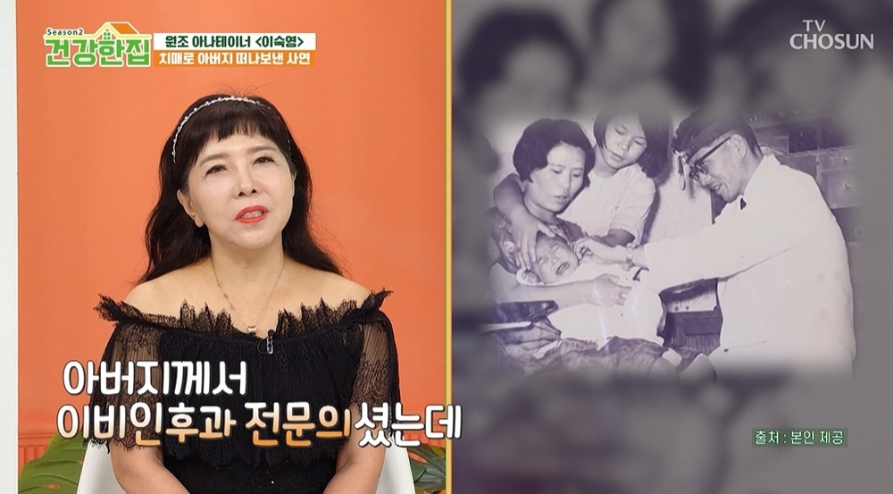 TV조선‘건강한집’캡처TV조선‘건강한집’캡처[뉴스엔박수인기자]아나운서출신방송인이숙영이치매로돌아가신아버지를떠올렸다.7월21일방송된TV조선'건강한집'에는68세이숙영이게스트로출연했다.이숙영은건강고민에대해"한번씩집비밀번호가생각이안나서완전충격을받았다.'혹시나도치매?벌써이러면어떡하지'하면서당황스러웠다.누구나이나이쯤되면깜빡깜빡하는일이많아져서대수롭지않게여겼는데생각해보니까그럴수없겠더라"고털어놨다.이어"아버지가치매를앓다가3년전에돌아가셔서치매가족력이너무걱정되는거다.아버지께서이비인후과전문의였는데90세까지도골프도하시고운전도하셨다.또패션을포기하지않을정도로굉장히멋쟁이셨는데갑자기목욕탕에서쓰러진후뇌경색,치매증상이나타났다.돌아가시기1년전부터치매증상이심해지셨다.옛날기억은잘하시는데단기기억을못하시더라.점차거동도불편해지고노쇠해지더니끝내치매를못이기시고한국나이로95세에세상을떠나시게됐다"고토로했다.뉴스엔박수인abc159@기사제보및보도자료[email protected]ⓒ뉴스엔.무단전재&재배포금지Copyright©뉴스엔.무단전재및재배포금지.