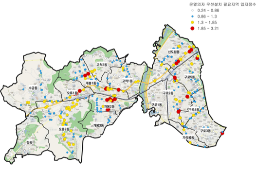 서울구로구내겨울철버스정류소온열의자신규설치수요가120곳에달하는것으로나타났다.서울AI재단이구로구제안으로겨울철대중교통이용불편을줄이기위해'버스정류소온열의자설치우선지역분석'을수행한결과다.이용패턴을기반으로설치권장정류소119곳을도출했다.서울AI재단이분석한구로구온열의자우선설치지역입지점수비교.서울시제공재단은온열의자설치사업의효과와활용도를높이기위해정류소이용패턴,교통약자분포,버스배차간격등다양한데이터를정량분석해설치우선지역을판단했다.운영시간효율화방안도제시했다.신규설치권장정류소는교통약자현황,교통약자이용시설접근성,버스정류소이용규모,정류소평균배차간격데이터등을활용했다.우선설치필요지역중구로2동(21곳),오류2동(19곳),신도림동(18곳),개봉1동(17곳)등에서온열의자설치수요가특히높은것으로확인됐다.출퇴근시간대에는업무지구인근정류소에서하루평균700~1000명이이용하며낮시간대에는병원·시장등생활시설인접정류소에서의이용률이뚜렷하게높게나타났다.일부정류소는월평균이용자수가100명이하로확인돼운영시간조정또는위치재검토가필요한것으로조사됐다.심야평균이용률은3%수준이었다.재단은이번연구가구로구온열의자운영개선뿐아니라유사한여건을지닌지역의데이터기반정책모델로확장될수있을것으로기대하고있다.김만기서울AI재단이사장은“연구는시민온열의자이용데이터분석을바탕으로서울시서비스의효율적운영방안을제시했다는점에서의미있다”며“앞으로도서울AI재단은데이터분석을통해시민이체감할수있는생활밀착형정책이현장에뿌리내릴수있도록지원하겠다”고말했다.박종진기자[email protected]©전자신문.무단전재및재배포금지.